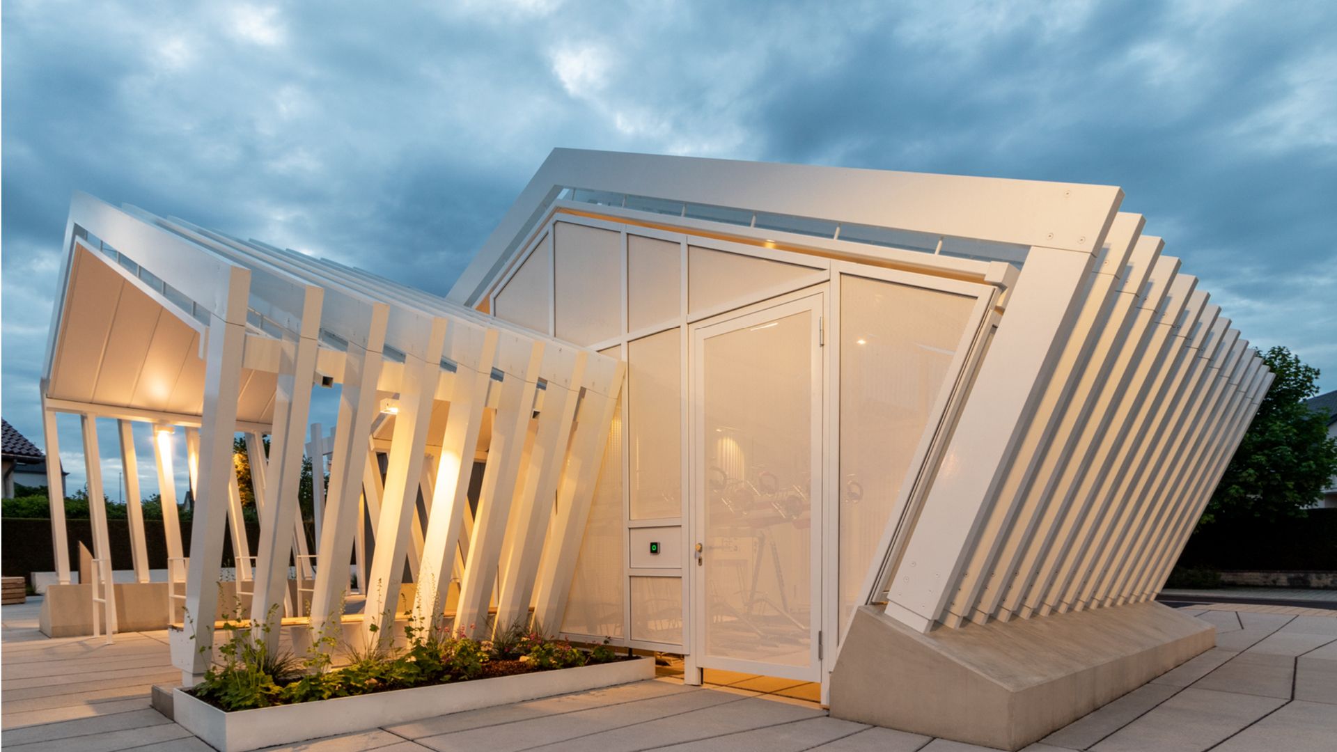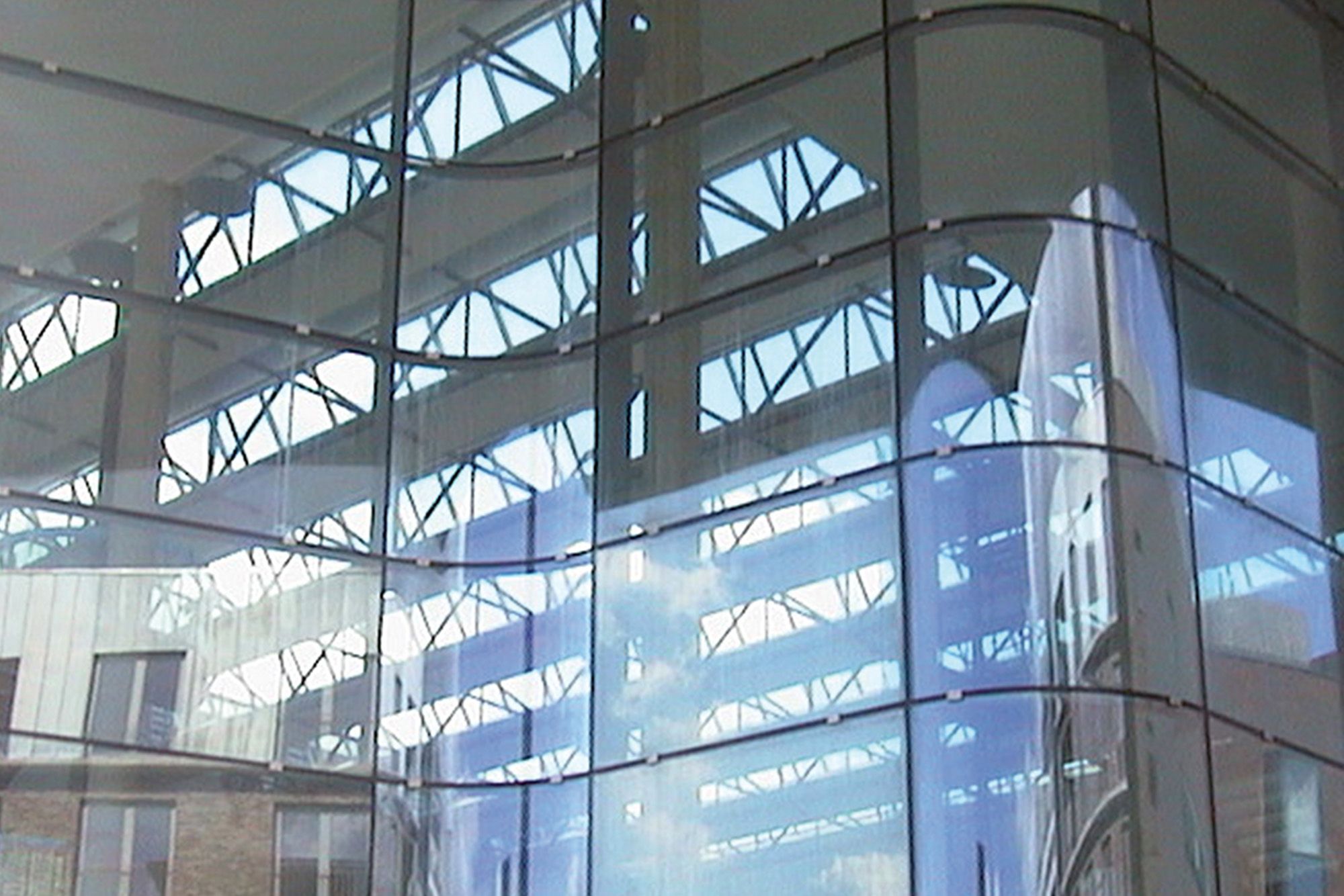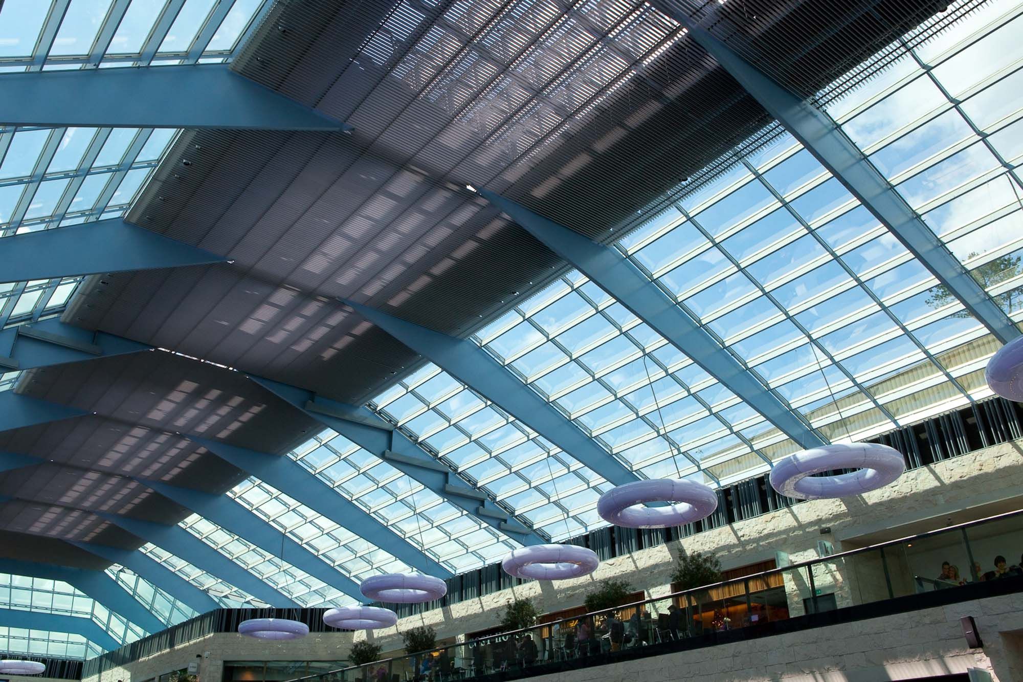 Zeven stalen luifels overdekt met gelijmd glas