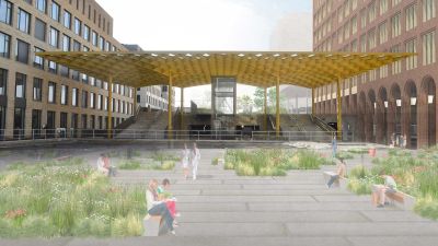 Tekst: A slender canopy has been built on the site of the University Hospital Gasthuisberg to accentuate the central circulation hub and guide visitors efficiently to their destination. The canopy covers the large circulation deck that incorporates the staircase and lift complex, and forms an important visual landmark at the western entrance zone. Measuring 43 x 27 m, it features a fully glazed steel structure with a large overhang to the side that provides shelter from driving rain. The construction height of the canopy decreases from 1,200 mm at the columns to 200 mm at the edges. The required structure is concentrated in 30 mm thick fins in S235 steel, which lie diagonally across the plane of the canopy and are welded together at nodes to form a single 1.4 m grid. The 16.5 m columns are made of S355 steel (type 406.4/30) and house the steel pipes for rainwater drainage and cabling for canopy lighting.