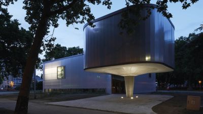 Tekst: The owner of this house works in the film industry and asked us to design an original hotel that his international guests would never forget. He also wanted to create an original setting for film previews and other cultural events. Conceived as a kind of cinematic experience that catapults its occupants from one atmosphere into another, the building’s abstract nature leaves it open to interpretation and serves as an elaborate surprise that breaks with the predictable concept of the traditional hotel room. The guest house has a laminated wood structure and a profiled weatherproof steel cladding that makes the whole structure blend seamlessly into the natural environment around it. It also features a steel spiral staircase, a steel construction around the stairwell and a steel structure for the cantilevered viewing point.
