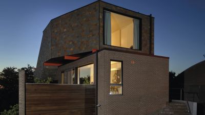 Tekst: This private house in the centre of Brussels has been completely transformed by the addition of a steel extension at the rear. This 6 m high extension standing 4.5 m long and 4 m wide and weighing around 4,500 kg, was designed as a whole and includes an integral staircase. As the new building section had been prefabricated in the workshop (a process that took three weeks plus a further one week for painting) it was installed in just three hours. The pared-down construction of 5 mm sheet steel reinforced with a set of five 20 mm thick by 100 mm wide portals made it possible to optimise the additional space, and the painted steel serves not only as a visual signature of the project, but also as an inner shell. The waterproof steel cocoon also acts as a natural vapour barrier beneath the external wall insulation around it. The steel is also fully recyclable.