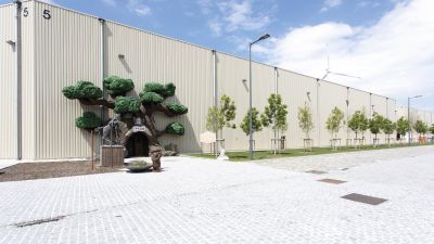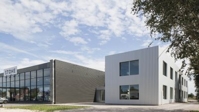 Tekst: The current mishmash of buildings that grew up organically on the premises of Stone, a wholesaler dealing in natural stone, terrazzo and ceramic tiles, was crying out for a clear sense of order. The site has been rethought and reorganised to create a functional separation between storage, production and staff areas. The new buildings (production hall, slab hall and office building) are built on a steel structure and positioned as freestanding independent spaces that conform to the laws of industrial construction. And although it is a natural stone processing company, all facades are finished with profiled metal cladding, thereby establishing a visual connection between old and new. Subtle differences in colour and degree of detailing differentiate the volumes according to their specific function. All the interiors of the various buildings are finished in the same white-painted, repetitive steel structure, which is left exposed.