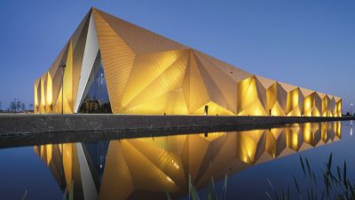 Tekst: The exterior of the new premises for the Dutch Royal Mint has the look of a vault, with almost no visible openings and a facetted facade inspired by the reliefs on Dutch Euro coins. The silver-gold sheets are standard profiled steel sheets (Isis 55/120-7 point profiles made of S280GD-Z225 grade steel prepainted in 50 µm Granite Silky Shine Gold) mounted on a backing structure of galvanized metal studs and angled in different directions to give a new dimension to the building. In total, approximately 62 tonnes of steel exterior cladding, 56 tonnes of profiles and 6 tonnes of flat steel for the fittings were installed on the facade. Inside the office, the courtyard and entrance are formed by a steel structure with V columns (HEA/HEB/IPE and tubes) – this took a total of 163 tonnes of grade S235/S355 steel with 802 SteelKote EP anti-corrosion protection, 2-component epoxy coating and a single 80 mu coat of RAL 9005 paint.