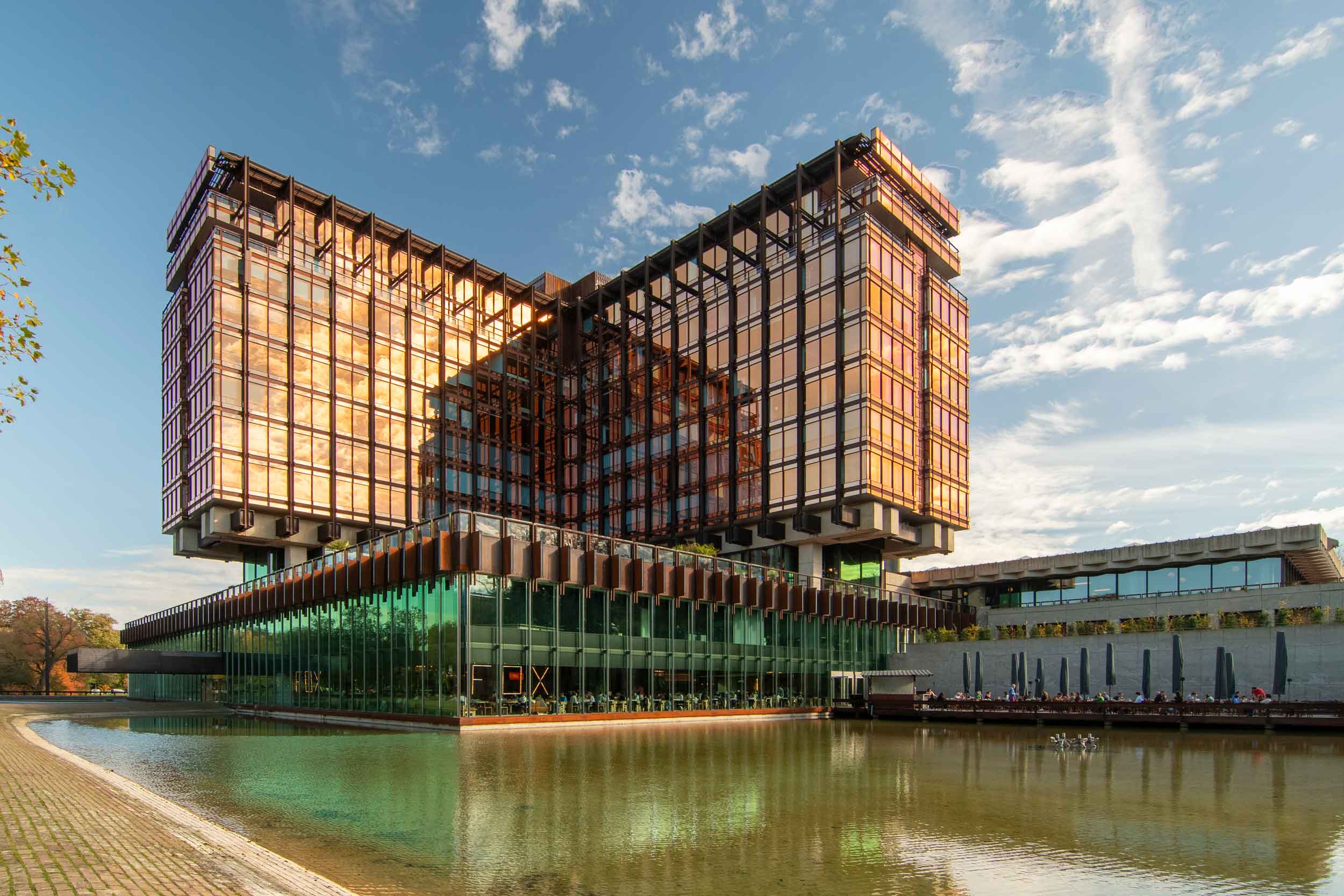 La façade extérieure d’origine en acier auto-patinable (‘corten’) a été conservée. L’intervention autour de laquelle le projet est construit est un vide circulaire créé au centre du plan. Le nouveau hall, d’un diamètre de près de 21 m et d’une hauteur de trois étages, s’articule entre les bâtiments avant et arrière, reliant le parking à l’hôtel et aux bureaux.