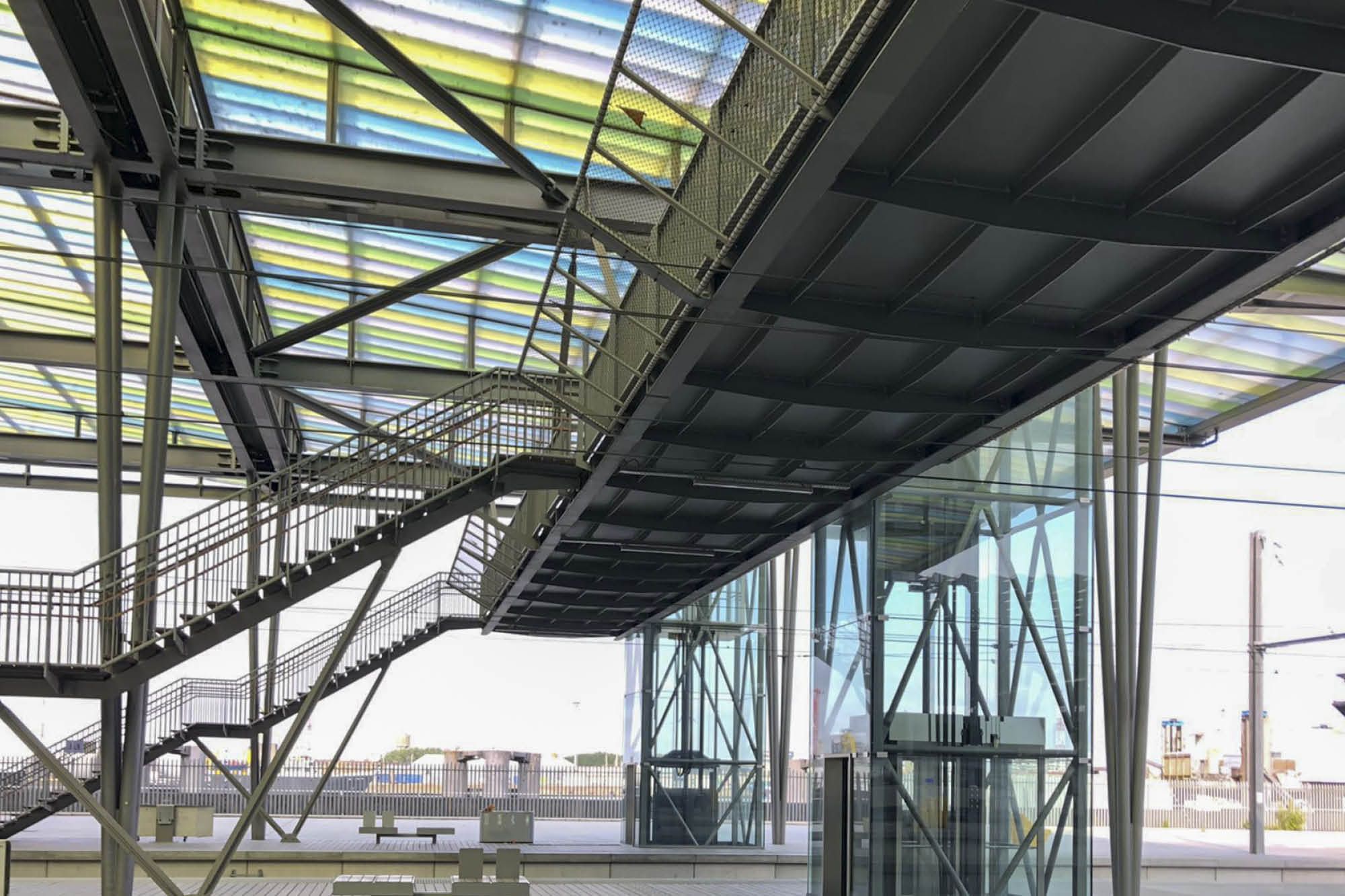 Le projet de reconversion de la “station aan zee” comprenait la restauration du bâtiment historique de la gare, la construction d’une série de nouveaux quais, le remplacement des anciens auvents de quai obsolètes par une couverture au niveau des différents quais (trains, trams et bus) et le parking à vélos souterrain, ainsi que le réaménagement du dépôt de tram et des places de parking. La construction de la passerelle piétonne en acier au-dessus des voies ferrées faisait également partie du plan directeur du quartier de la gare d’Ostende.