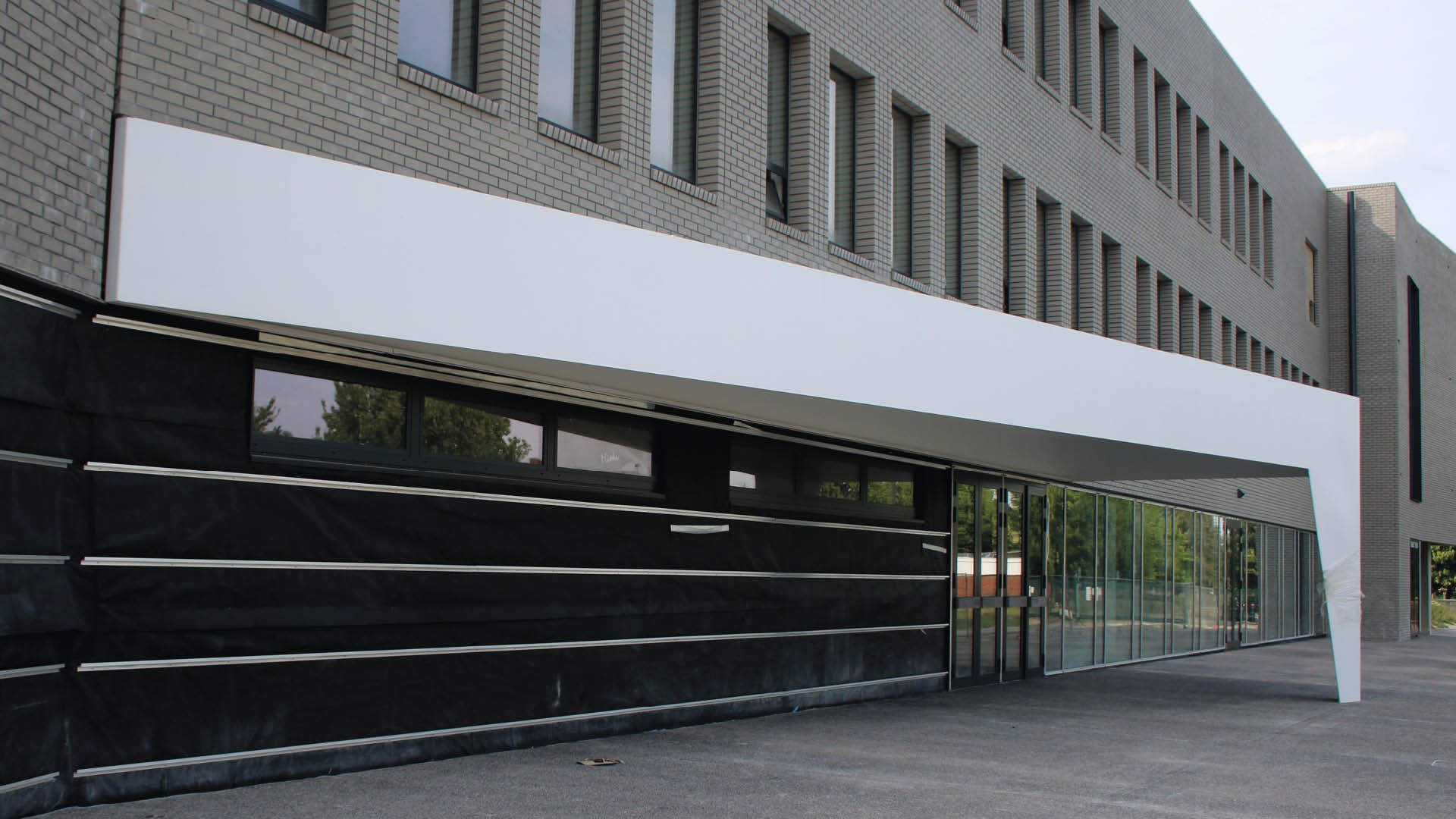Ce nouveau bâtiment scolaire comprend un grand auvent en acier (20 m de long pour 4,5 m de large) de forme singulière, dont la masse visuellement significative est délicatement posée au sol via un seul point d’appui.