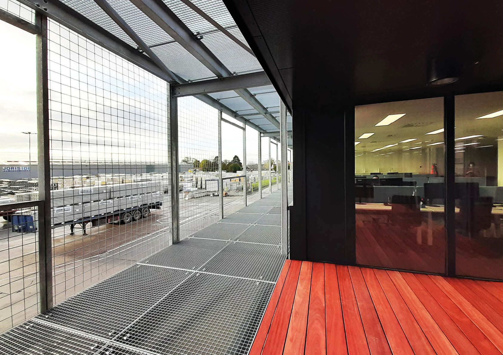 L'étage supérieur est constitué de plateformes en mezzanine, revêtues de dalles de moquette. Le toit est composé d'un steeldeck et d'une isolation en laine de roche. La façade sud est revêtue de panneaux sandwichs. Ceux-ci sont fixés à des profilés horizontaux et laminés à froid, auxquels la charpente est fixée. Une structure extérieure végétalisée a été placée devant la façade. Transparente et galvanisée, cette structure est composée de profilés légers et de grilles de plancher, tout comme les escaliers de secours. Des plantes grimpantes se répandront progressivement sur l'ensemble de la façade grâce à des armatures galvanisées pourvues de larges ouvertures.