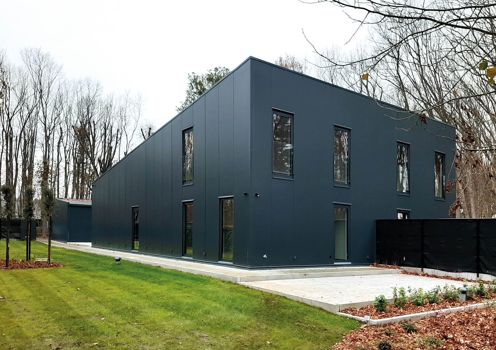 Le choix d'une structure en acier s'est donc imposé, pour que la phase d'exécution soit aussi courte que possible - l'ensemble du processus, de la démolition aux finitions intérieures, n'a duré que neuf mois ! – mais aussi pour des raisons économiques et écologiques (recyclage). Les murs et le toit sont intégralement revêtus de panneaux sandwichs industriels de couleur gris anthracite. La face antérieure du toit surplombant le pignon vitré pour éviter la surchauffe, ainsi que les murs donnant sur les terrasses sont habillés de bois, ce qui offre un élégant contraste visuel.