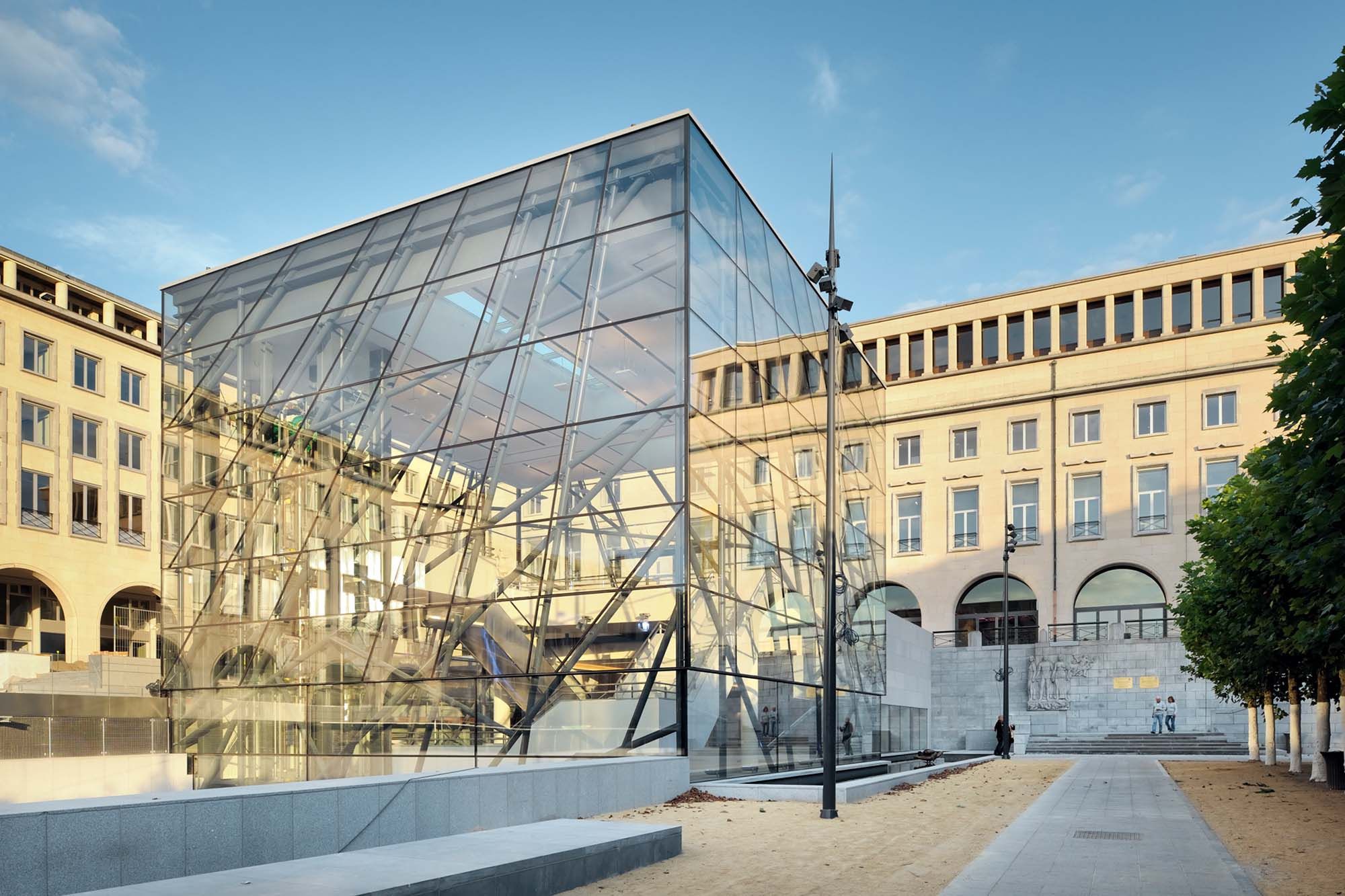 L’un des objectifs de la rénovation du Palais des Congrès de Bruxelles (devenu le Square Brussels Meeting Centre) visait à obtenir une grande lisibilité du bâtiment. De l’extérieure un emblème poétique identitaire marque l’entrée principale sous la forme d’un cube de verre. La structure arborescente du cube, traitée tout en transparence et en lumière, évoque l’architecture de jardin. Cette monumentalité douce et poétique dialogue avec le tracé des espaces publiques extérieurs. Le cube abrite un ruban d’escaliers suspendus et des passerelles reliant les différents niveaux d’accès du complexe. Le choix de profils en acier permet de réaliser une structure d’apparence aussi légère, transparente et aléatoire, qui souligne ainsi le caractère végétal du lieu.