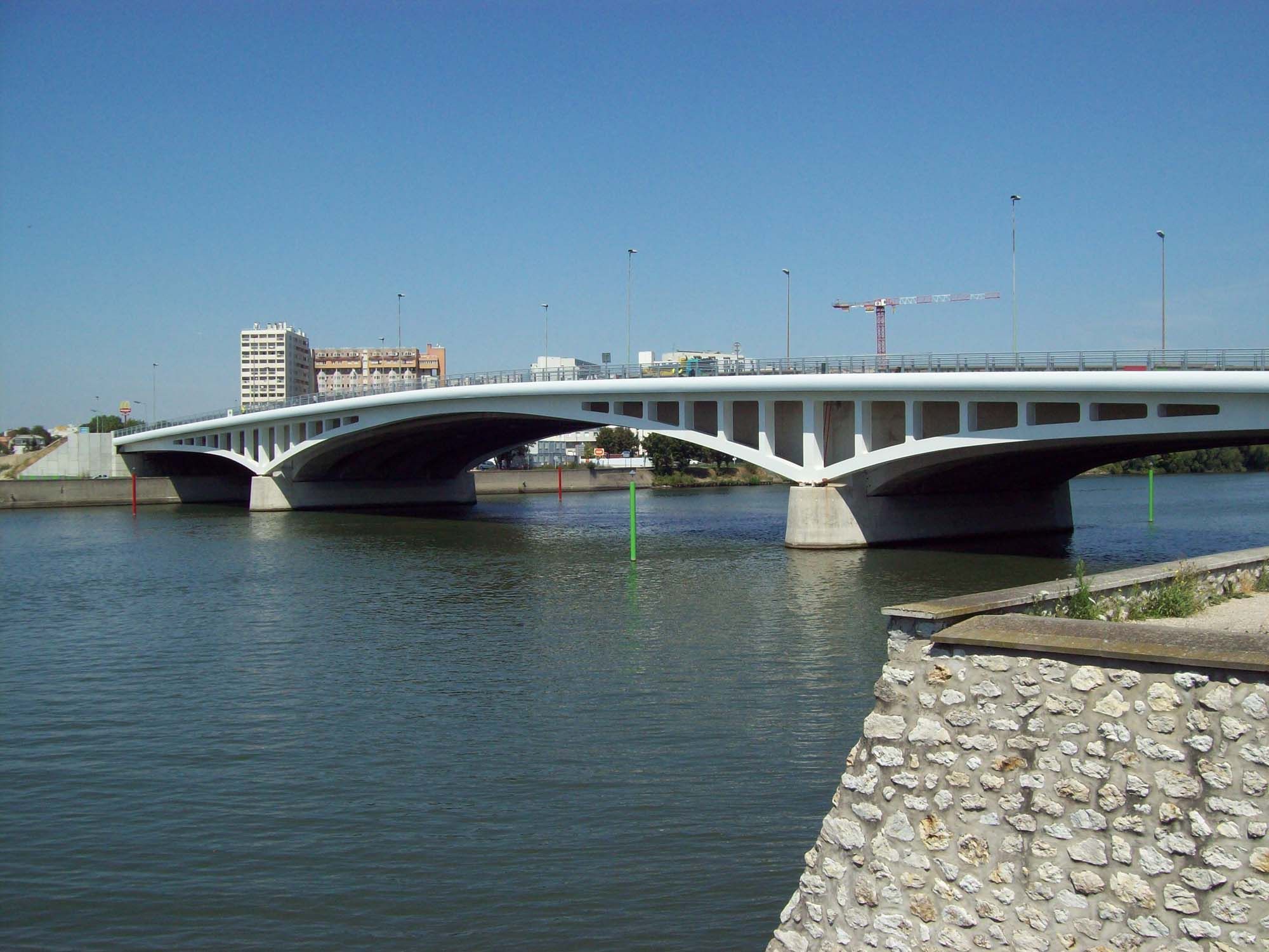 En conséquence, la circulation piétonne et cycliste a été reportée sur deux nouvelles passerelles métalliques ajoutées latéralement à l’ouvrage existant. Préfabriquées , les structures métalliques qui reprennent l’esthétique en arcs du pont, ont été déplacées par barges et mise en place par une grue mobile depuis le ponton.