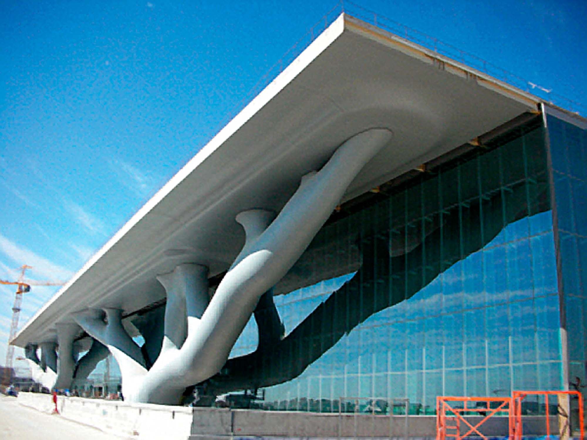 L’attraction principale du Qatar National Convention Centre à Doha - un centre de congrès de 65 000 m², est son hall d’entrée, conçu par Arata Isozaki. Le Convention Centre ne représente pas un simple arbre, mais plus spécifiquement le plaqueminier (sidra tree). Cet arbre tropical à feuillage persistant est l’unique espèce d’arbre considérée comme sacrée par les musulmans au Moyen-Orient. Le hall d’entrée du Convention Centre est long de 300 m, large de 30 m et haut de 20 à 30 m. Il s’agit en réalité d’un immense toit en acier, soutenu par quatre gigantesques structures arborescentes de 8 m de section transversale. Pour donner forme aux arbres, le concepteur a opté pour une structure portante intérieure plus ou moins réaliste, constituée d’une structure en tôle de caissons pyramidaux octogonaux. Autour de cette structure, 4 000 tôles en acier courbées ont été appliquées au total.