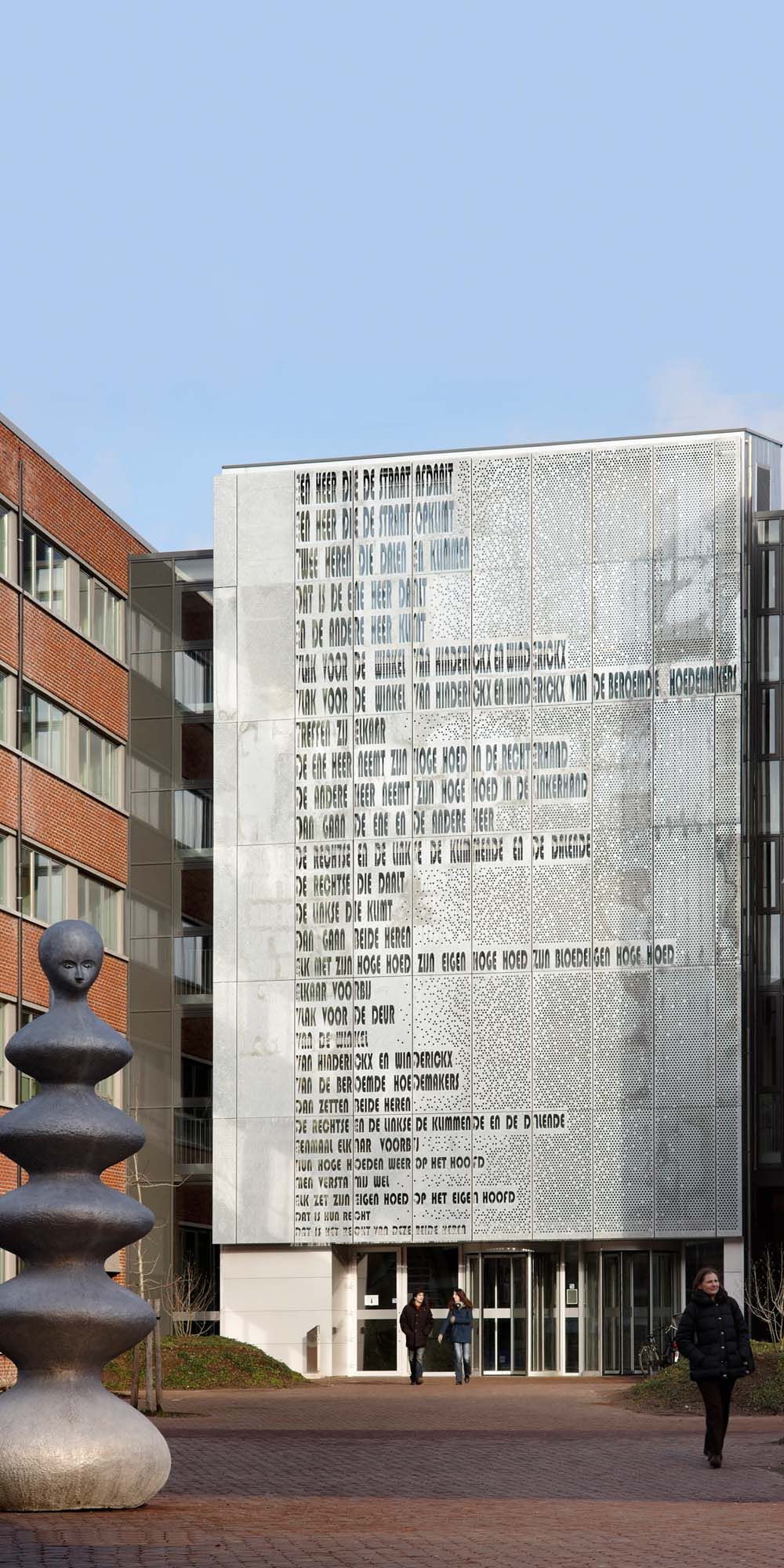 L’œuvre d’art, placée environ 40 cm devant la façade, est un texte écrit en lettres d’acier inoxydable. Le lettrage extérieur contribue à l’identité et au caractère reconnaissable du bâtiment.