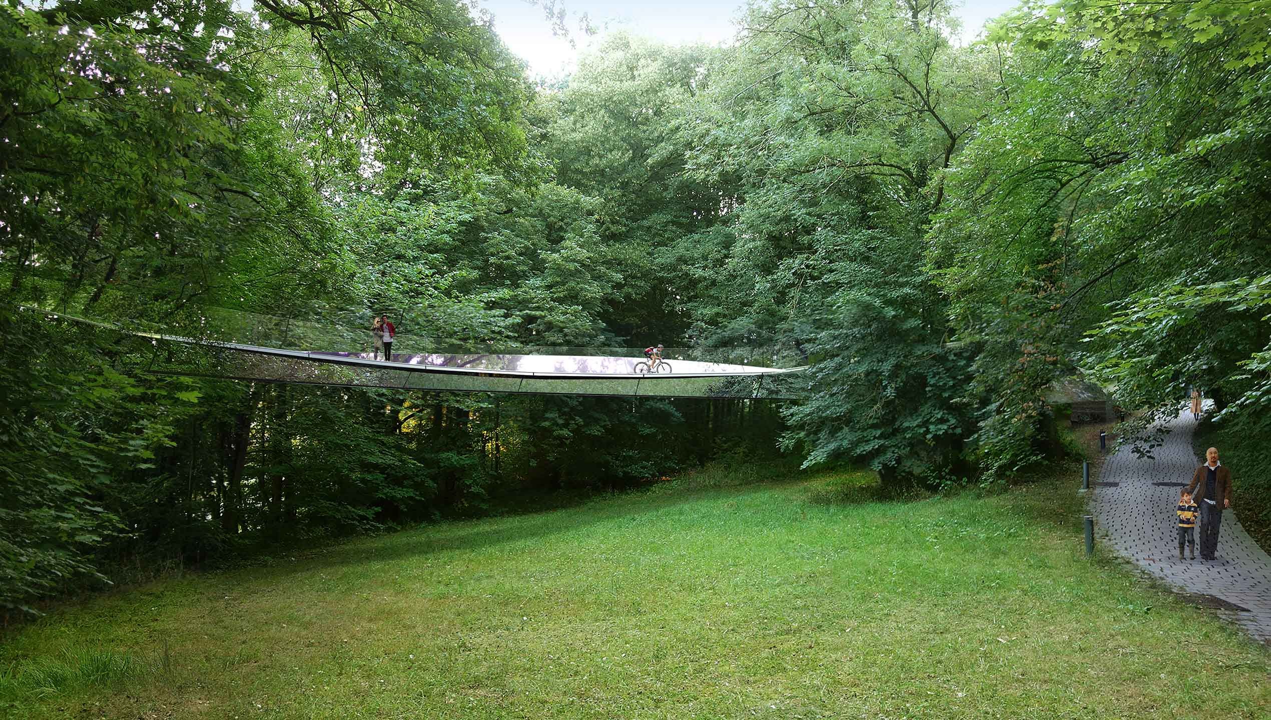 La nouvelle passerelle piétonne et cyclable relie le développement urbain contemporain du plateau de Kirchberg avec le musée d’art moderne du grand-duché du Luxembourg en traversant la forêt domaniale des Trois Glands.