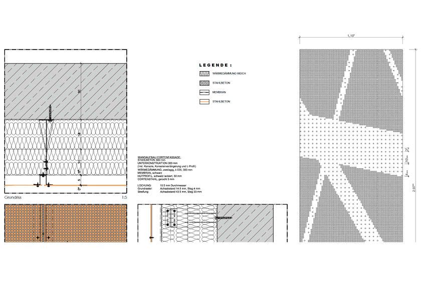 Deze 3000 m2 grote sporthal is bekleed met een gevel in geperforeerde weervast staalpanelen (corten). Aangezien hij geïnspireerd is op de natuur en de omliggende bossen, creëert de cortenstaalgevel de beoogde ruwe, natuurlijke uitstraling. Andere troeven zijn het economische aspect en de lange levensduur. De perforaties genereren een beeld van kriskras door elkaar lopende stroken met verschillende breedtes. Elk geperforeerd metaalpaneel is uniek om de continuïteit van de patronen te garanderen. Ze zijn ook doorgetrokken naar het interieur. Vanaf de inkompartij heb je een royaal uitzicht op de zitjes van de toeschouwers en het sportveld beneden. Achter de tribunes blijven de perforaties zichtbaar. Dit draagt bij tot de creatie van een unieke lichtbeleving en filtert de zichtlijnen naar de straat. De openingen in de gebouwschil, die ongewoon groot zijn voor een sporthal, zijn strategisch gepositioneerd om de band met de omgeving te versterken.