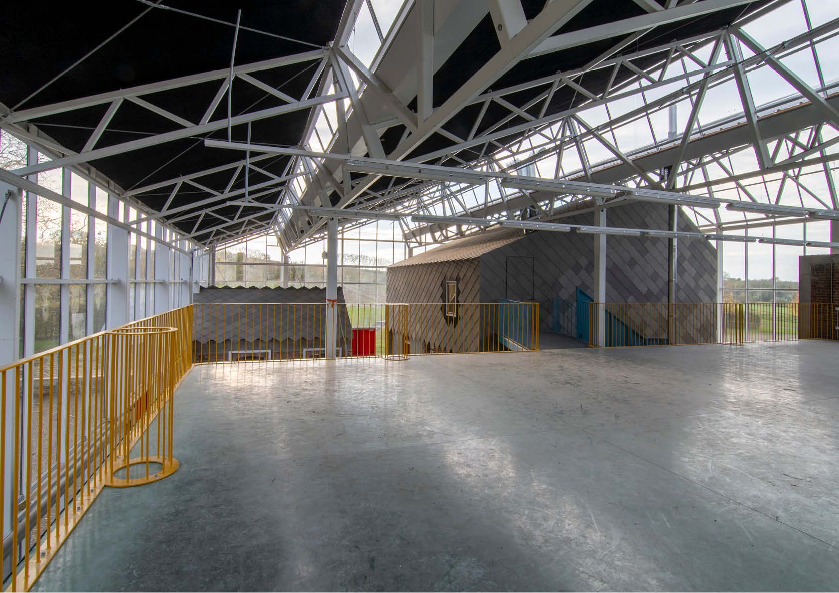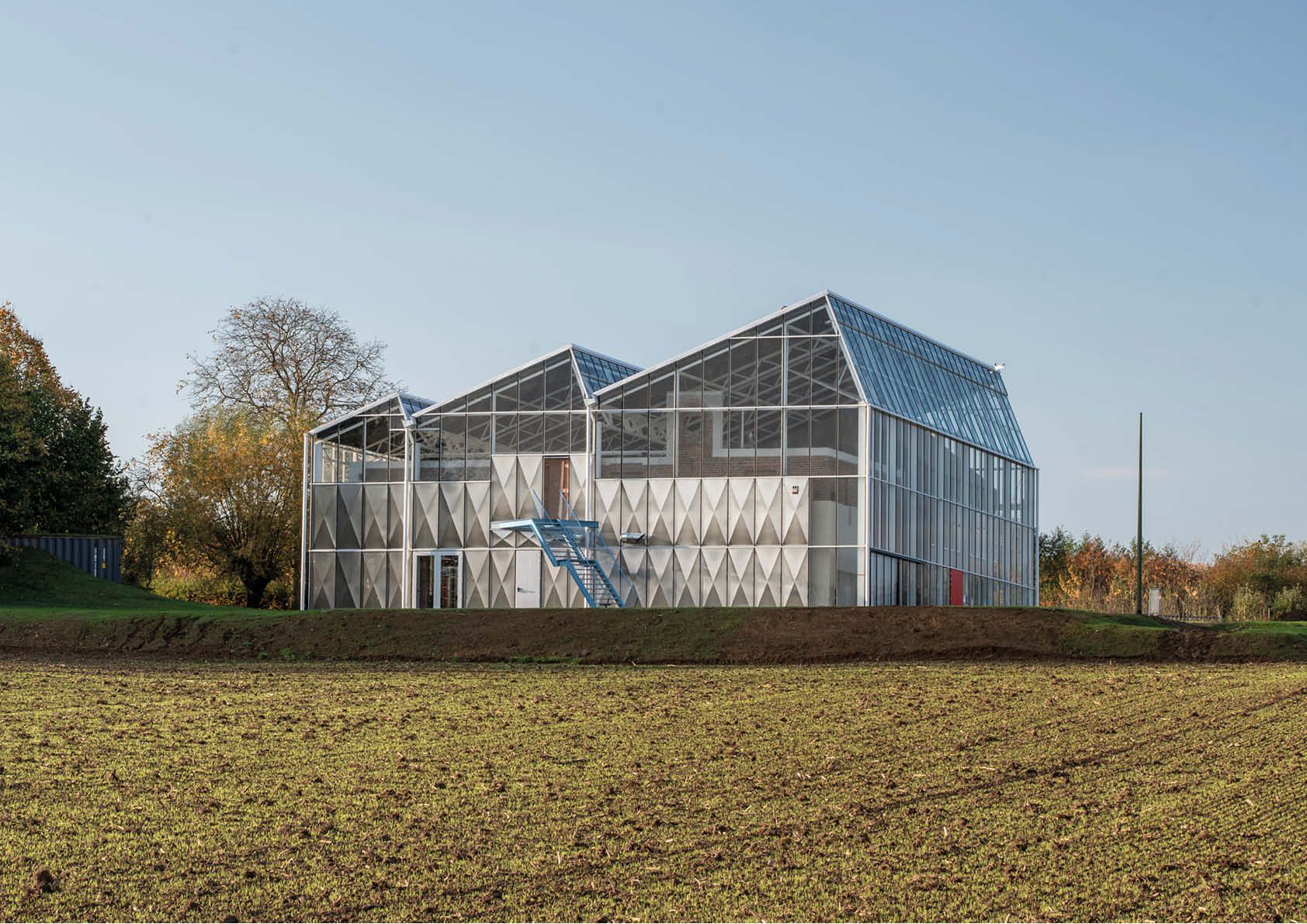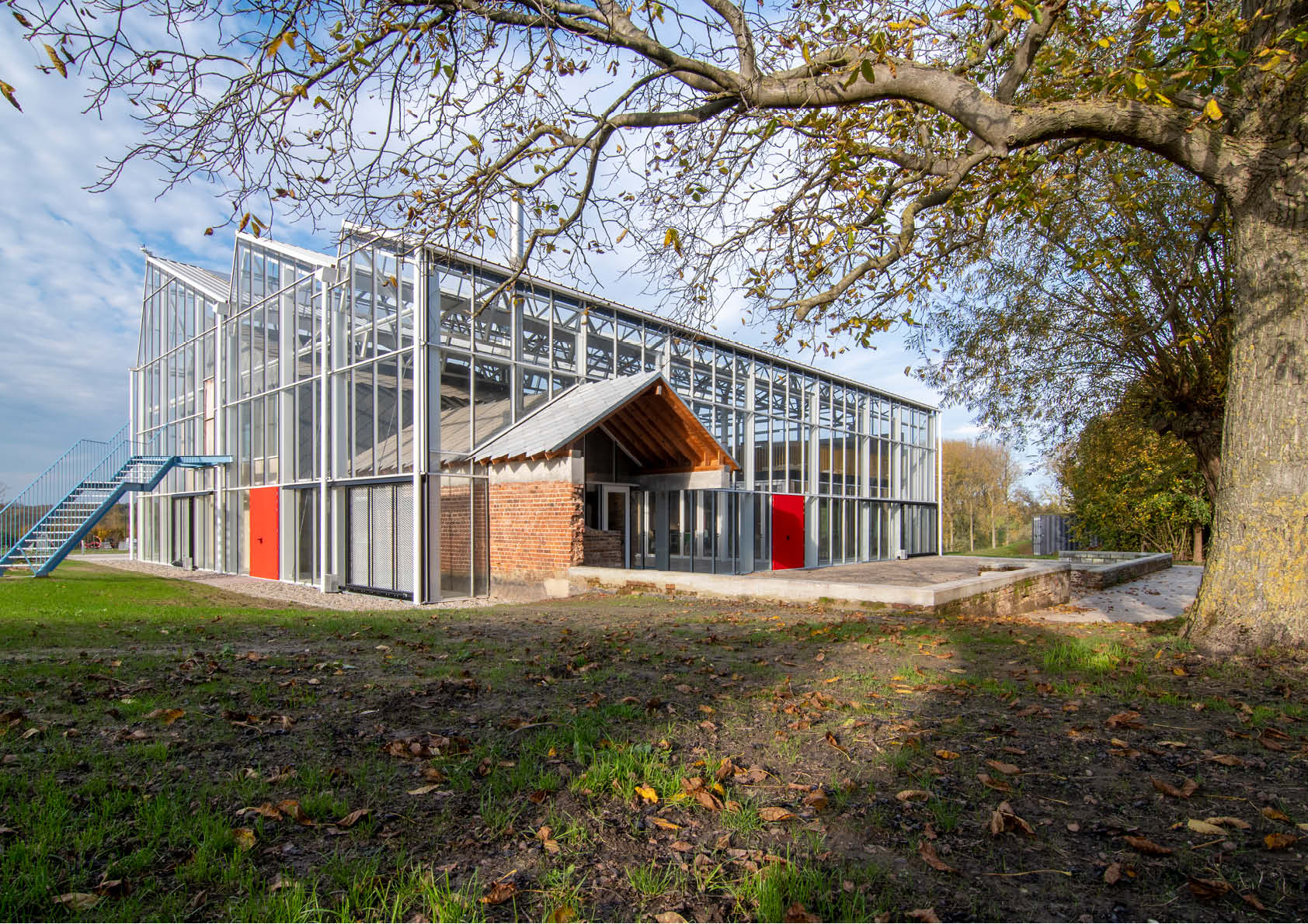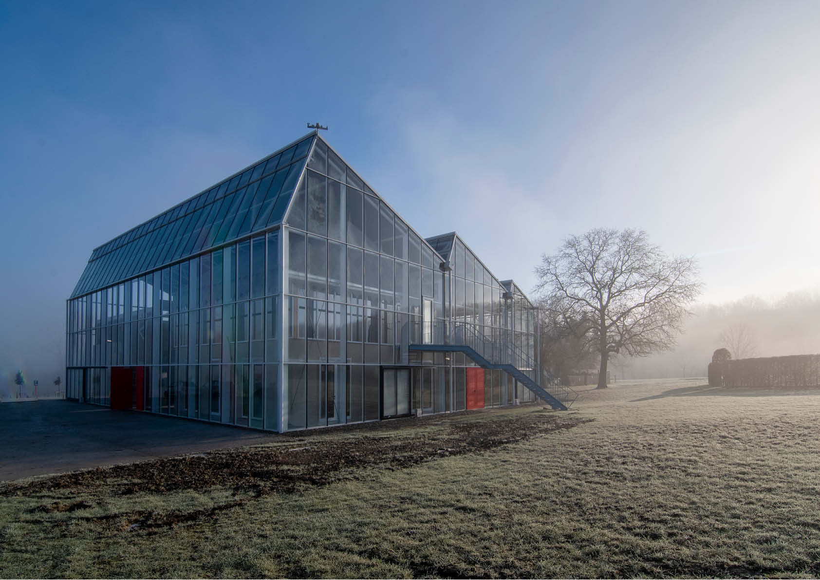 De serre die gebouwd werd rond een stalen skelet – goed voor 23 ton - heeft een afdalend sheddak dat de ideale lichtinval uit het noorden toelaat. Binnen de onverwarmde serre heerst bijgevolg een tussenklimaat. De bezoekers zijn er beschut tegen regen en wind en kunnen toch genieten van het schitterend uitzicht op de omgeving.