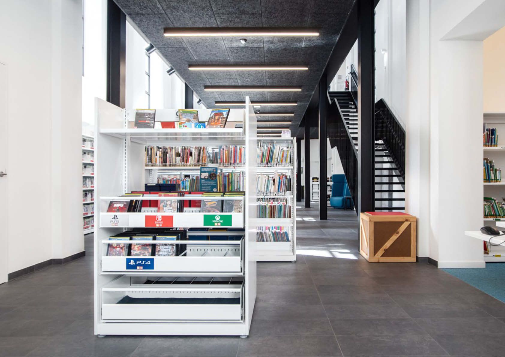 In de bib bestaat de mezzanine uit een stalen skeletstructuur met daarop een betonplaat gestort als draagvloer voor de eerste verdieping en stalen balustrades en trappen. Aan de ingang van de bibliotheek werd ook nog een kleine stalen luifel uit vlak staal voorzien. Er werd gebruik gemaakt van I-, H-, koker- en C-profielen.