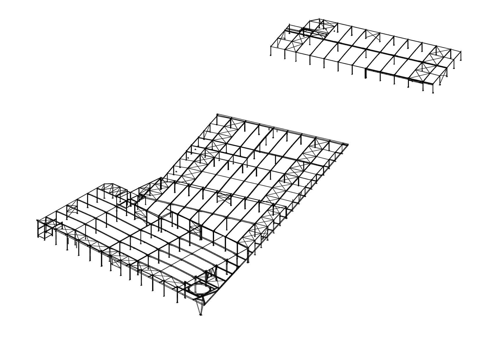 De staalstructuur bestaat uit profielstaal, kwaliteit 235 en 355. De delen zijn gestraald, geprimerd en gelakt in een verflaag van zinkfosfaat. De delen langs de buitenzijde zijn gegalvaniseerd en gelakt in een twee componentensysteem op basis van PU. Vlak staal werd gebruikt voor de vervaardiging van alle verbindingsstukken, kop- en voetplaten van de structuur.