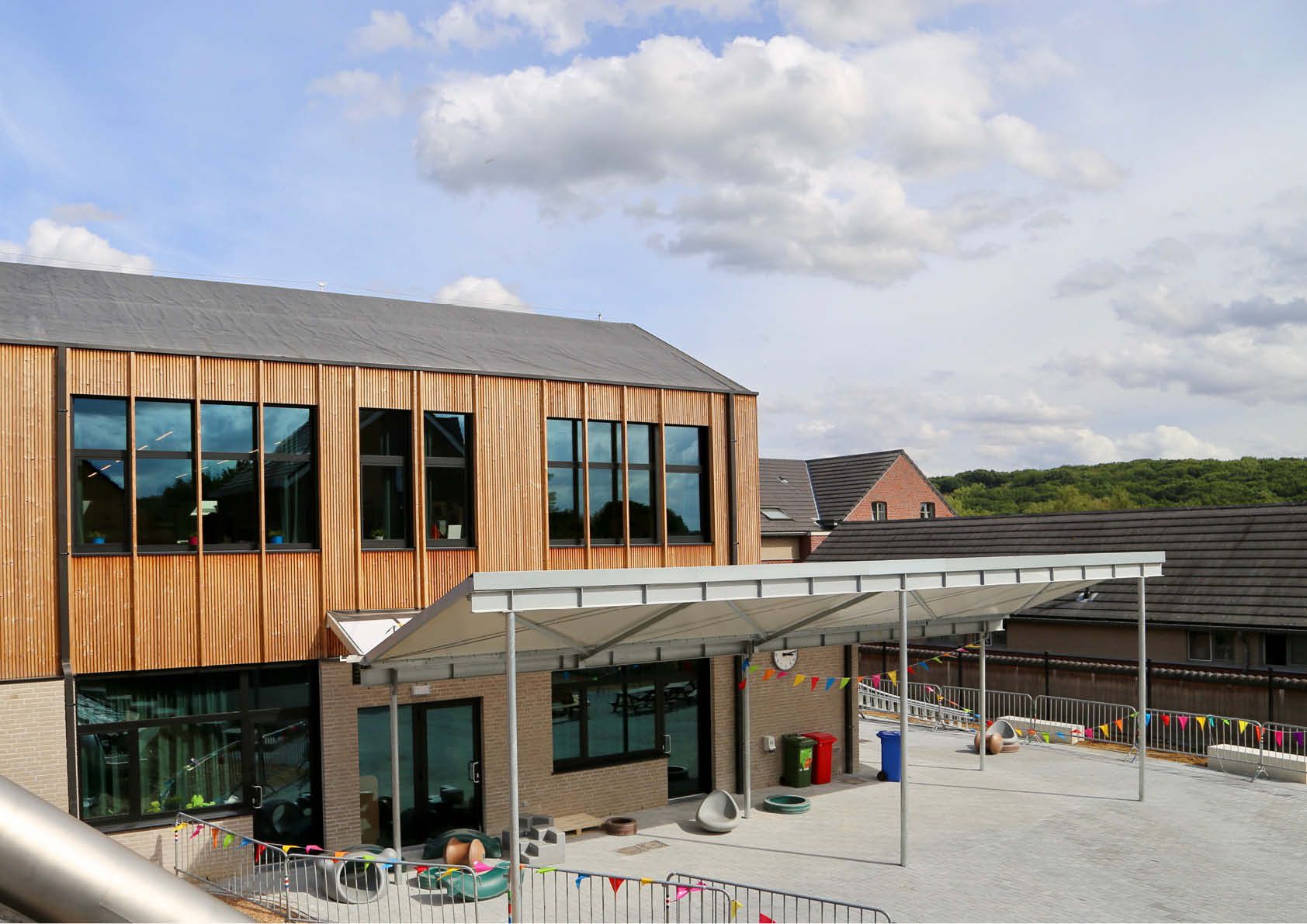 Vlak bij de kerk van Loonbeek, op een enigszins ‘verborgen’ site achter een historische en recentere bebouwing aan de Sint-Jansbergsteenweg, werd een nieuwbouw met een lagereschool- en kleuterafdeling opgetrokken. In het ontwerp werd de relatie met de glooiende omgeving versterkt via de weloverwogen inplanting van het gebouw én de interactie tussen buiten en binnen via uitgekiende zicht- en toegangsopeningen in de gevels, die zijn afgewerkt met klassieke gevelsteen en verticaal houten latwerk.