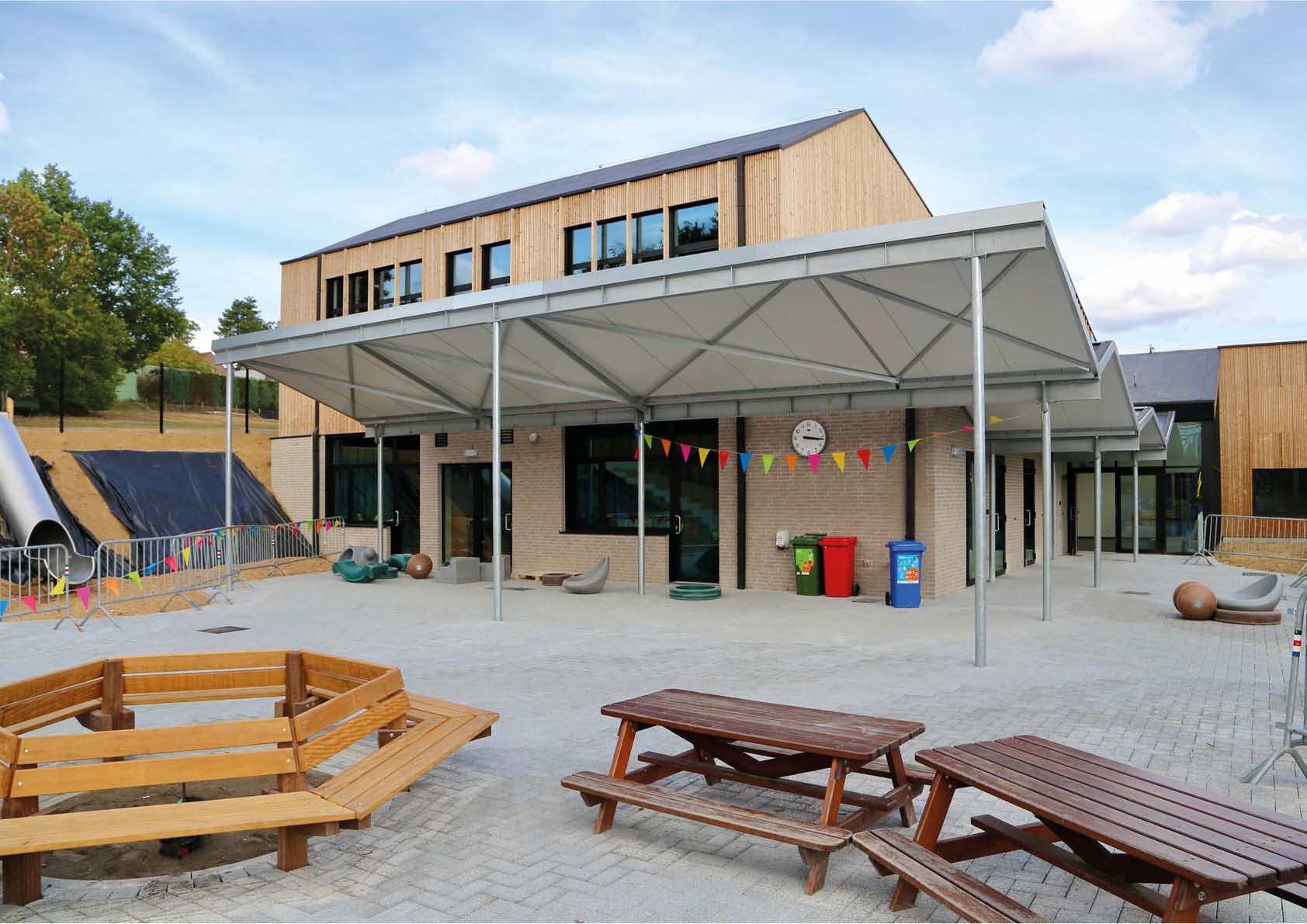 Samen met de geknikte dakvormen creëert de kronkelende stalen luifel (13,5 x 5 meter + 11,7 x 2,6 meter) een speelse, kleinschalige uitstraling, waardoor het geheel een uitnodigend karakter krijgt. De karakteristieke luifel bestaat uit gegalvaniseerde kolommen, liggers en een dakbedekking in sandwichpanelen. Hij versterkt een eerste as vanaf de schoolpoort naar de beglaasde hoofdinkom en vormt op die manier een ideaal oriëntatiepunt voor bezoekers.