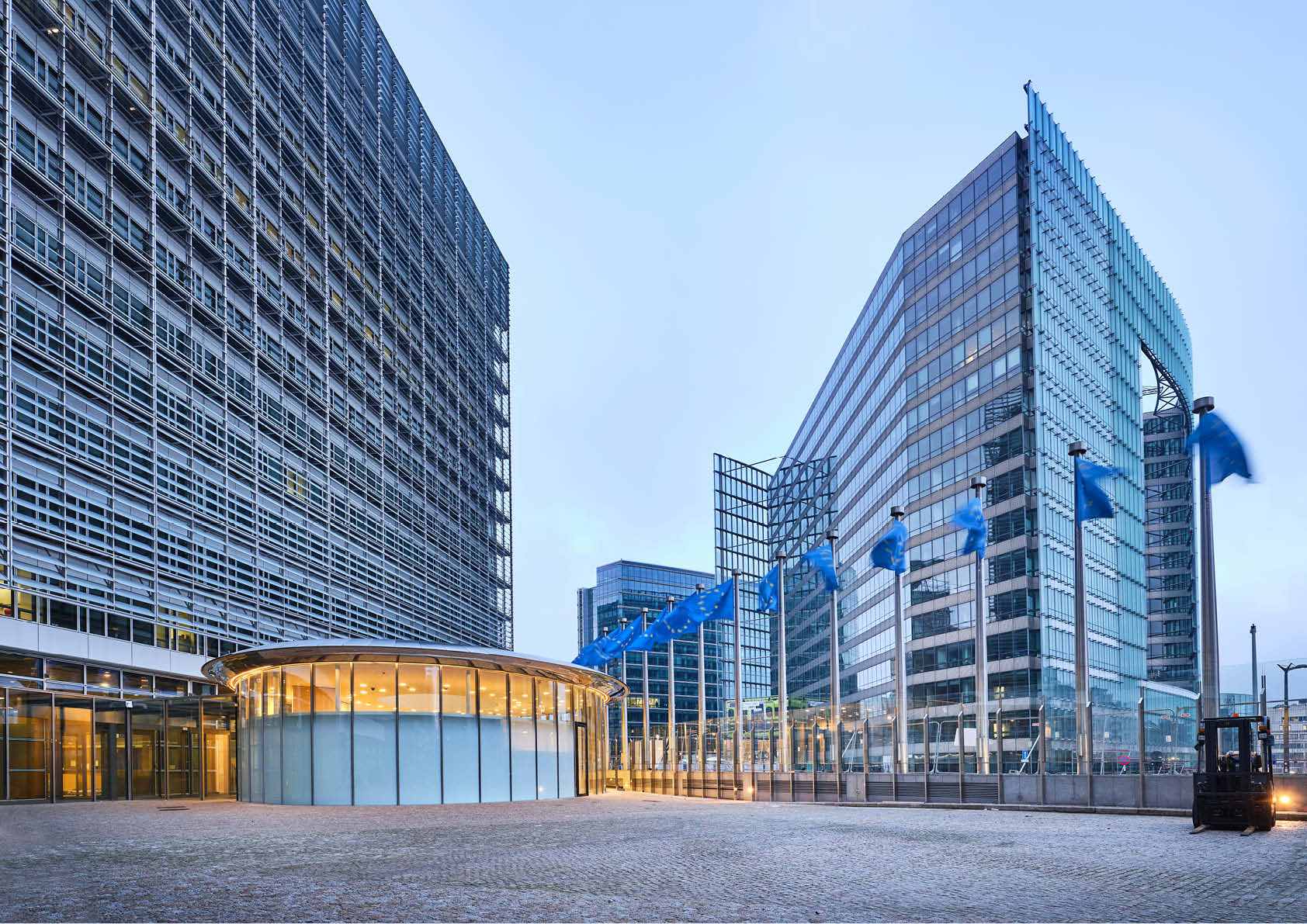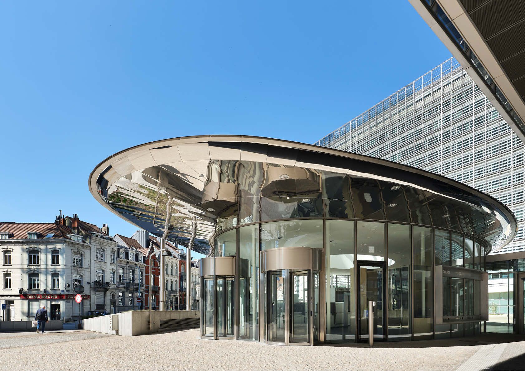Voor de Europese Commissie in Brussel is aan de voet van het Berlaymontgebouw een ellipsvormig paviljoen opgetrokken om bezoekers te ontvangen en het terrein beter te beveiligen.