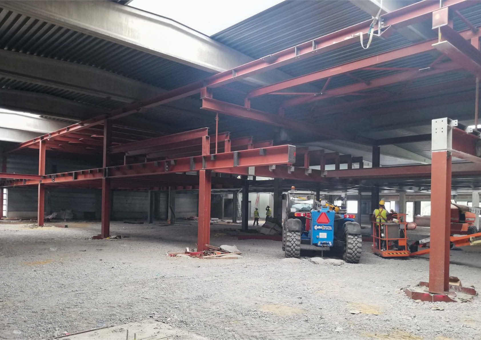 Alvorens de werken aan te vatten, werd een volledig nieuwe onafhankelijke fundering voorzien, uitgevoerd door middel van gevulde stalen voerbuizen. Gezien de constructie binnen het bestaande gebouw moesten de lengte en het maximale gewicht van de stalen liggers beperkt blijven. In totaal werd maar liefst 565 ton staal voorzien voor de verdiepingsvloeren, inclusief een volledige brandwerende behandeling (meer dan 10.500 m² brandwerend schilderwerk). Op de staalconstructie zijn 2700 m² roostervloer en 1.250 m² zwaluwstaartvloeren (Cofrastra) geplaatst.