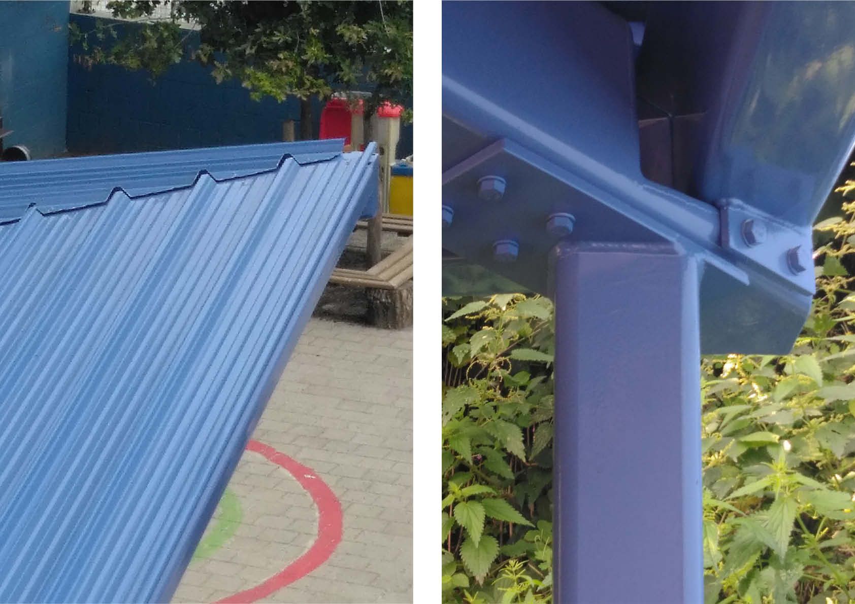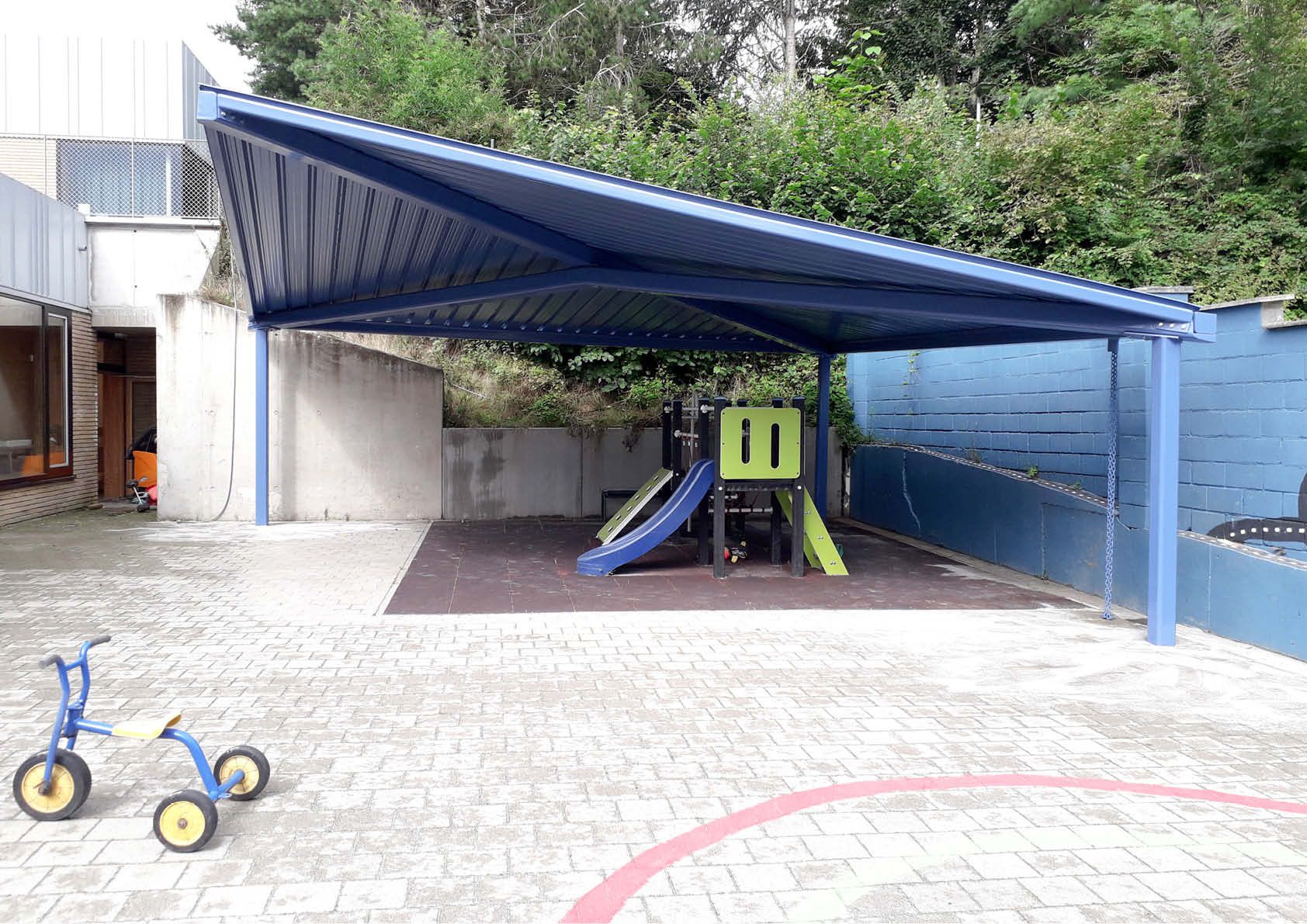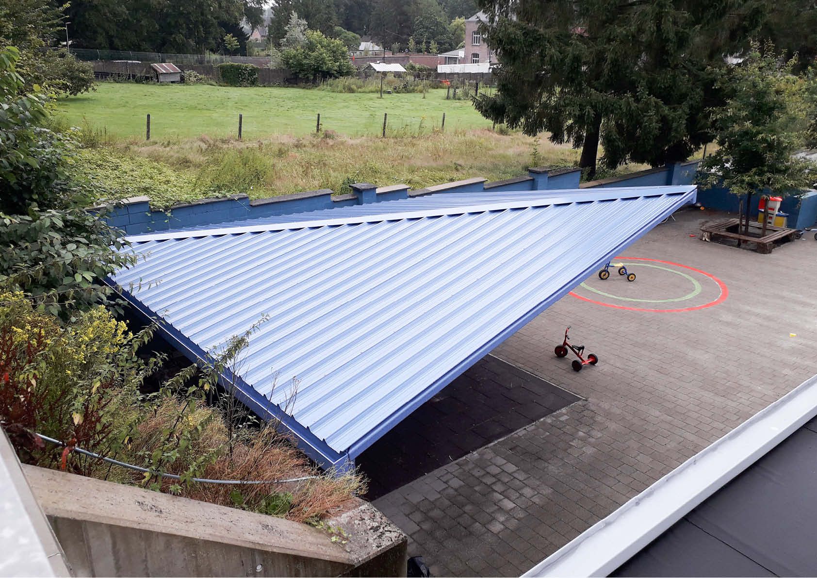 Kleuters in alle seizoenen en weersomstandigheden kunnen laten buitenspelen: dat was het uitgangspunt voor de realisatie van deze markante luifel, die een deel van de speelplaats (circa 60 m²) overdekt. Het gaat om een lichte staalstructuur – 3 ton kokerprofielen in S355J2H-staal, thermisch verzinkt en nadien voorzien van een poedercoating in RAL 5023 – met een puntvormig dak om voldoende lichtinval en een kolomvrije hoek te creëren.