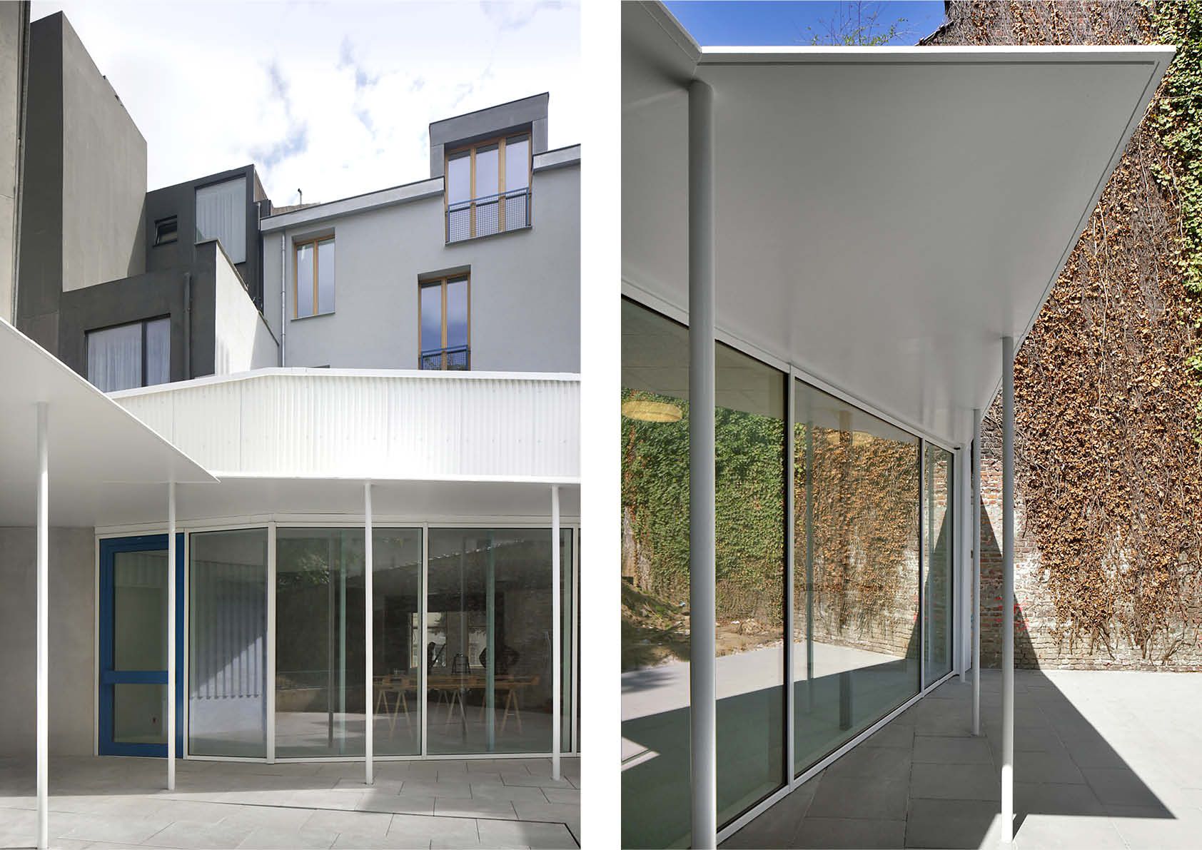 Er werd voor een dubbele strategie gekozen: enerzijds het uitpuren van het terrein en het zorgen voor een maximum aan licht; anderzijds het introduceren van een nieuwe structuur van open ruimtes en gebouwen. De nieuwe gebouwen worden in eenzelfde typologie opgevat, met name open tuinpaviljoenen van één niveau. Alle geveldelen en ruimtelijke elementen van de publieke ruimte werden in dezelfde staalelementen uitgevoerd. Het gebouw wordt gedragen door lichtblauw gelakte stalen kolommen. Een fijne luifel in staal markeert de relatie onderling en met de publieke ruimte.