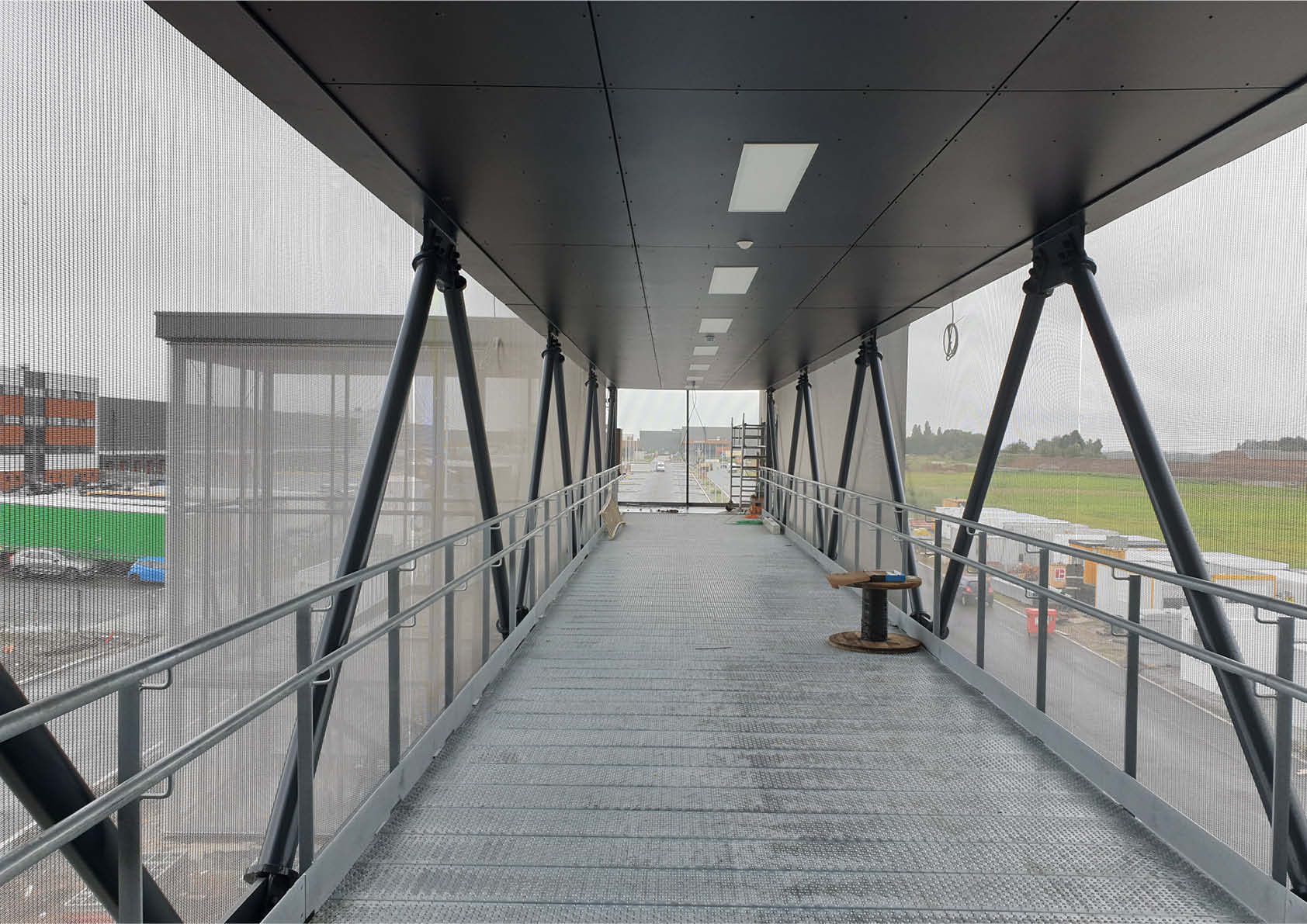 Dit grootschalige project omvat een prefabbetonnen kantoorgebouw van 3200 m² en een enorme logistieke hal van 30.000 m², die is opgetrokken in staal. Deze laatste bestaat uit een regelmatig ras-ter van kolommen. Alle dakbalken, zowel de hoofd- als de secundaire liggers, zijn opgevat als stalen vakwerkliggers, die behandeld zijn met brandwerende REI30-verf.