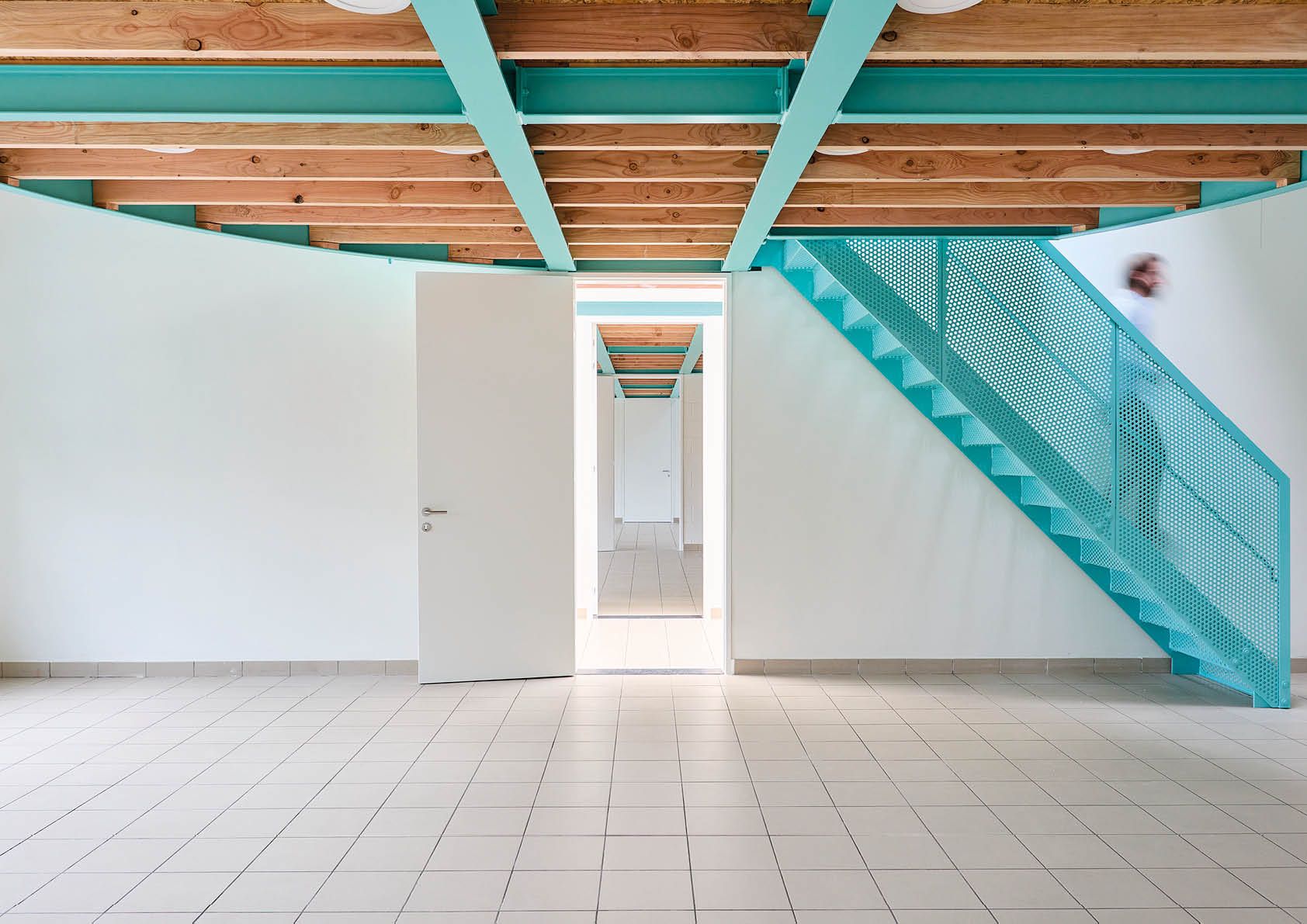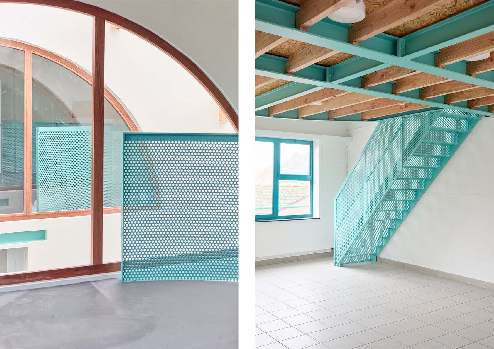 De bijbehorende trappen en kindvriendelijke balustrades zijn opgebouwd uit geperforeerde stalen platen. Zo ontstonden rustige, afgesloten cocons die toch voldoende licht doorlaten en doorzichten bieden naar de onderliggende klassen. De mezzanines zijn gelakt in een blauwgroene kleur die reeds aanwezig is in het gebouw. Een leuke extra is dat de geboute staalstructuren magnetisch zijn en dus ook kunnen fungeren als educatieve magneetborden.