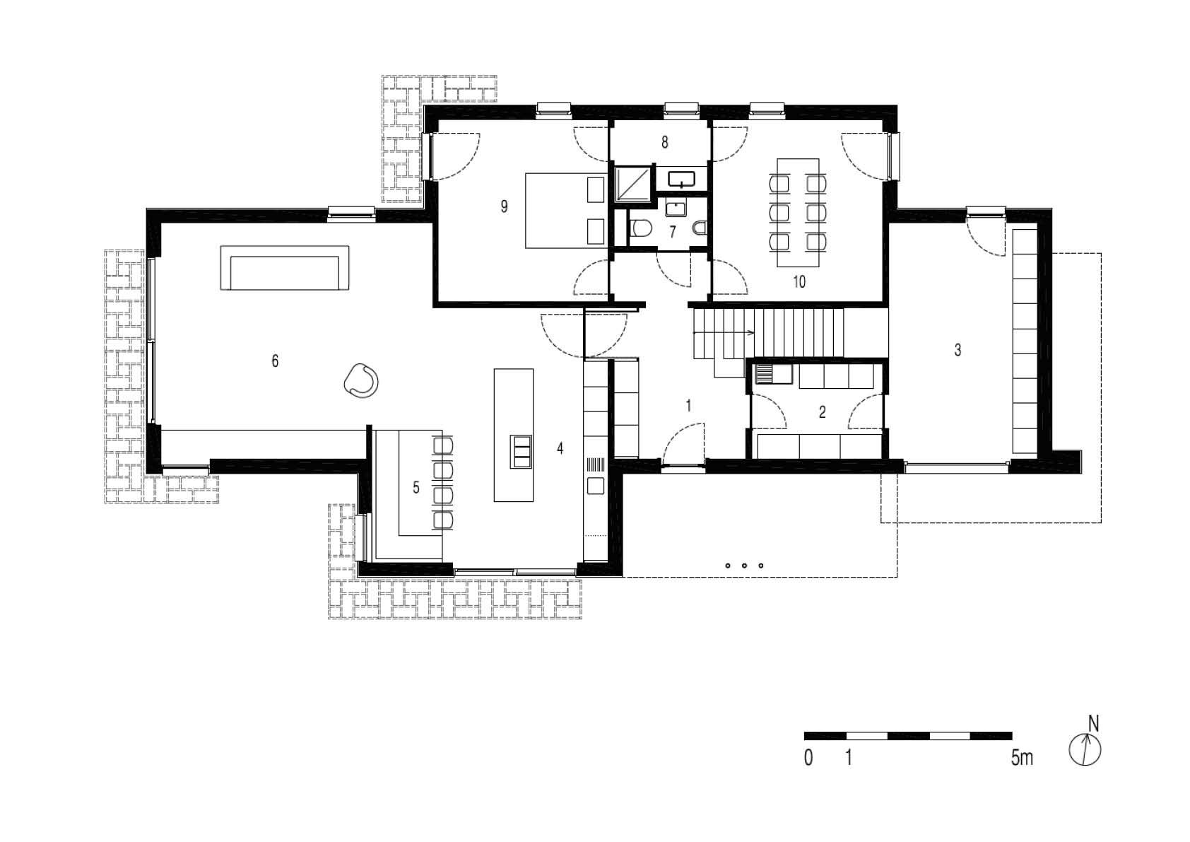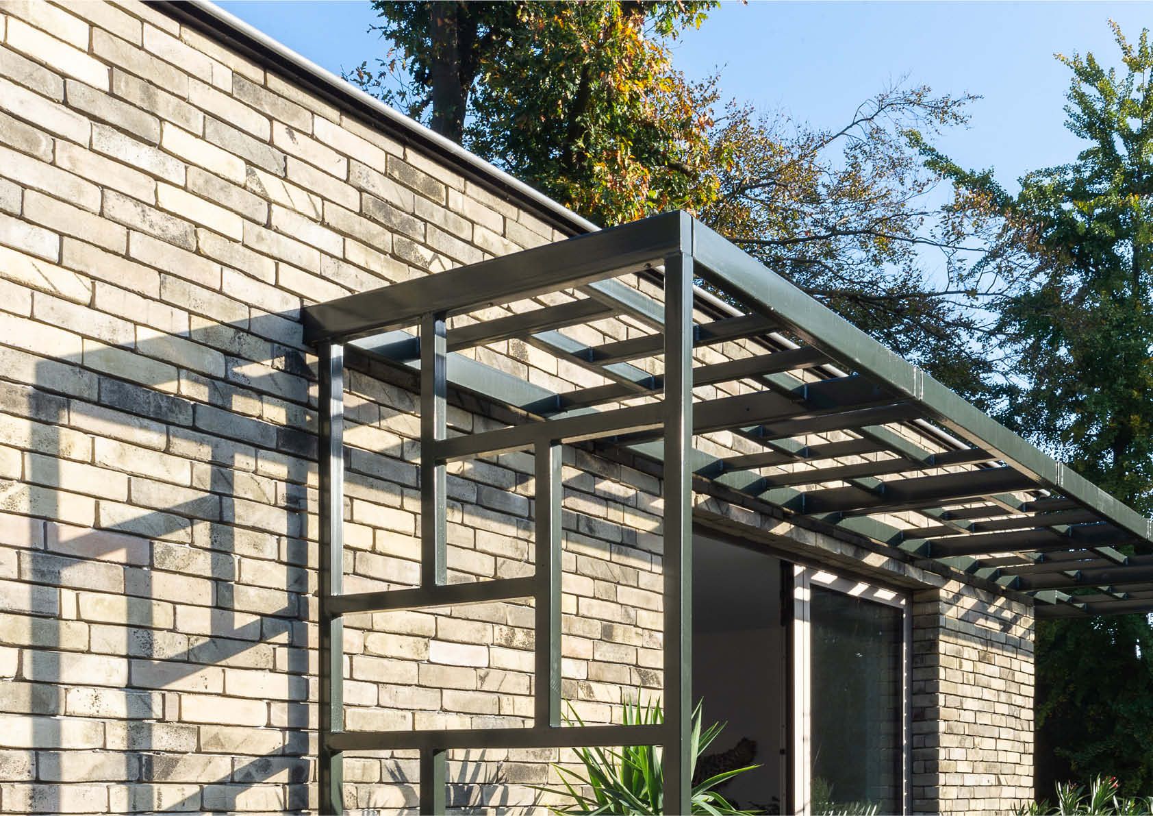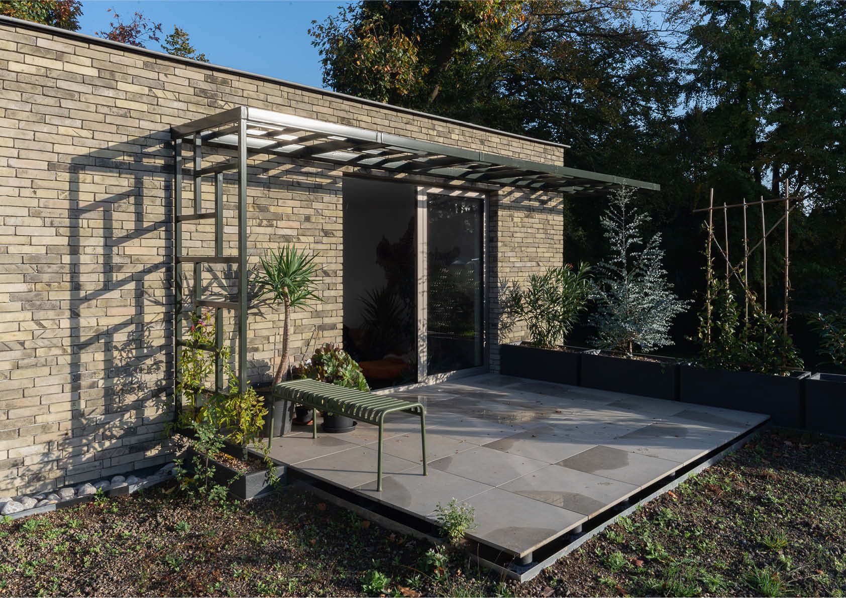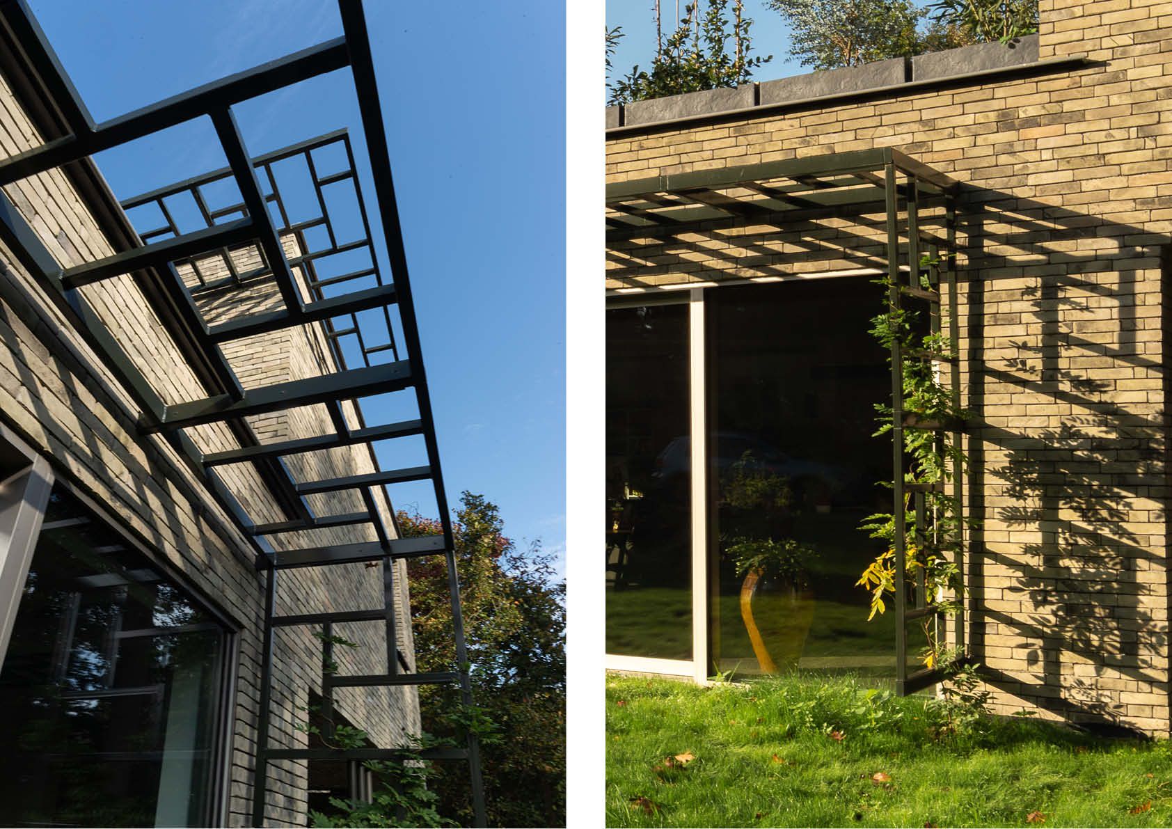 Dankzij haar vorm, het uitgekiende materiaalgebruik en de specifieke kleurkeuze is deze eengezinswoning met architectenbureau perfect ingebed in de groene omgeving. Het idee was om oververhitting via de zuid- en westgerichte glaspartijen te vermijden door middel van schaduwrijke en verkoelende klimplanten op drie stalen luifels. Deze laatste zijn telkens opgebouwd uit drie vlakken, ingedeeld in segmenten met een wederkerend patroon en opgehangen tussen stalen vinnen die aan de ruwbouw bevestigd zijn.