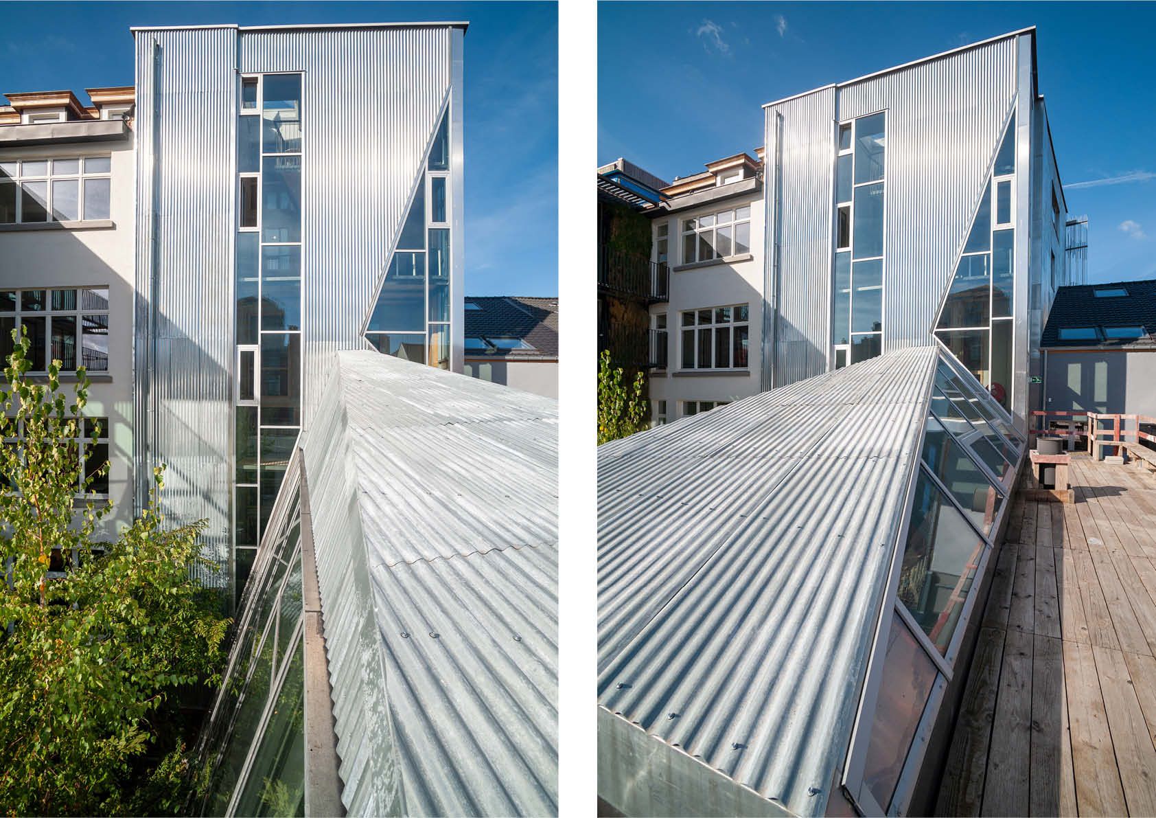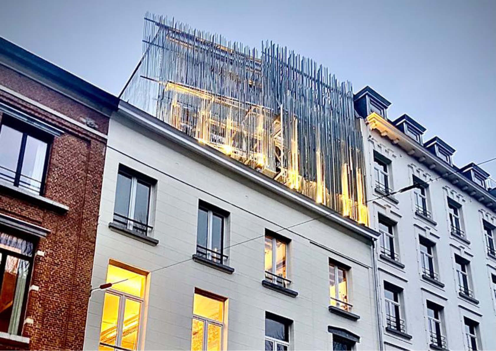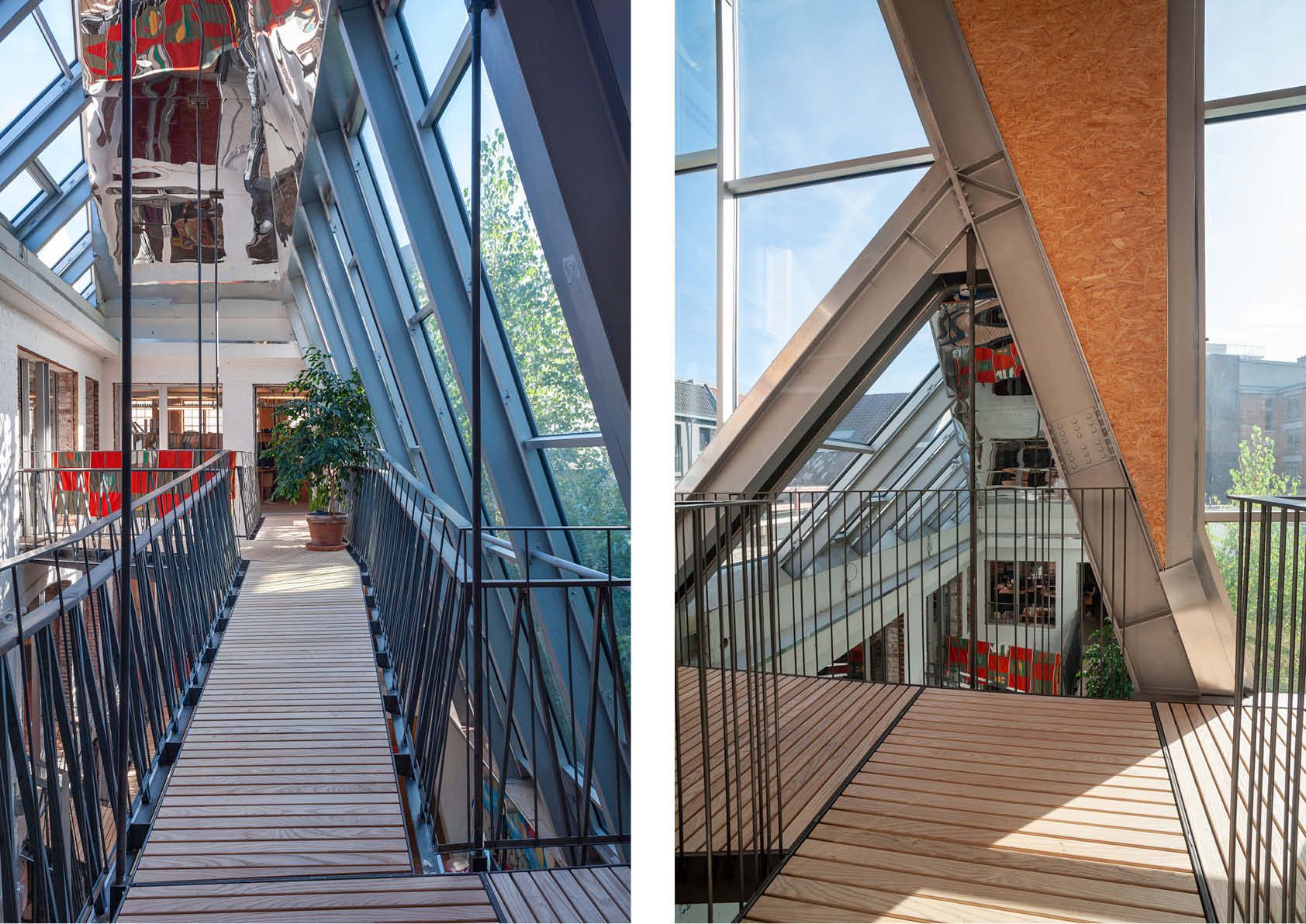 Staal is de rode draad in bijna alle architecturale ingrepen, van de verhoogde gevel aan de straatkant tot de nieuwe achtergevel, de glazen koepel en een fantastische circulatievoorziening met trappen en passerelles die leven en werk in het neoklassieke gebouw opnieuw definiëren.