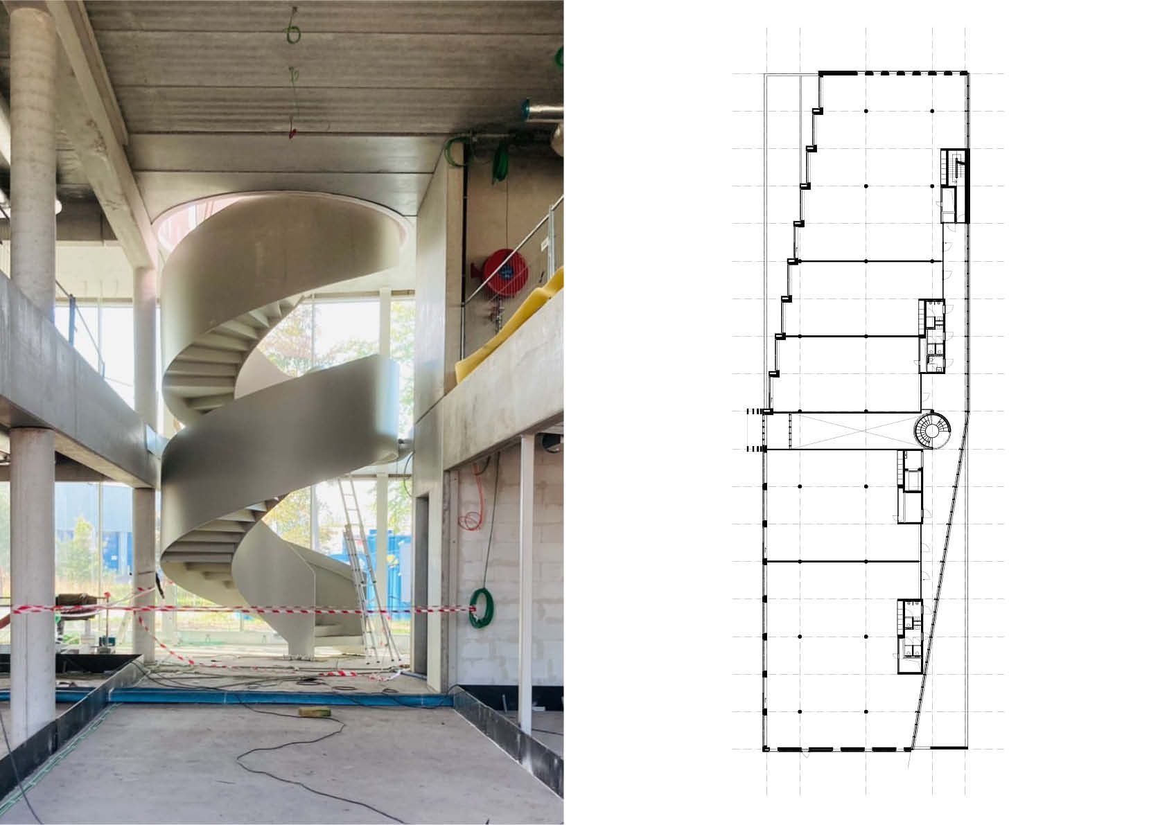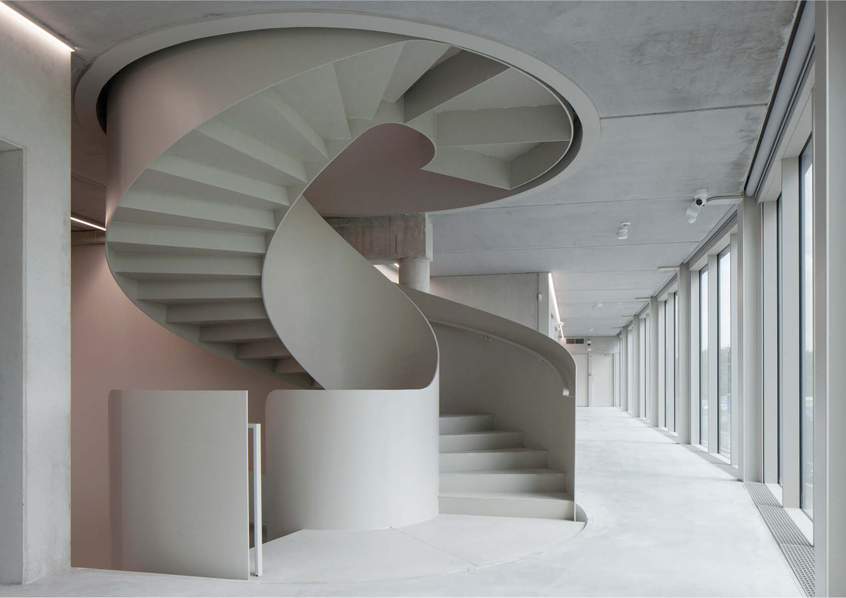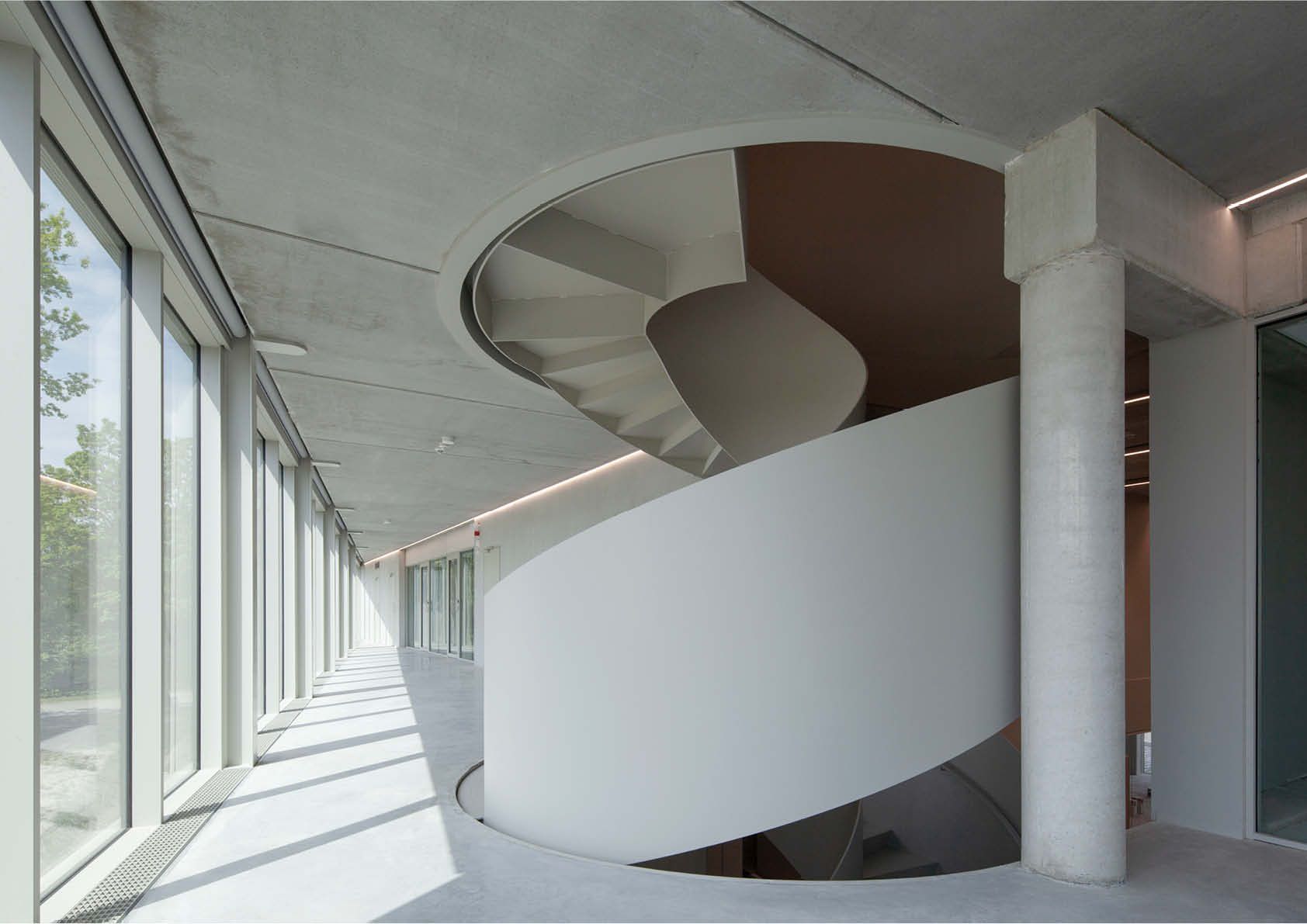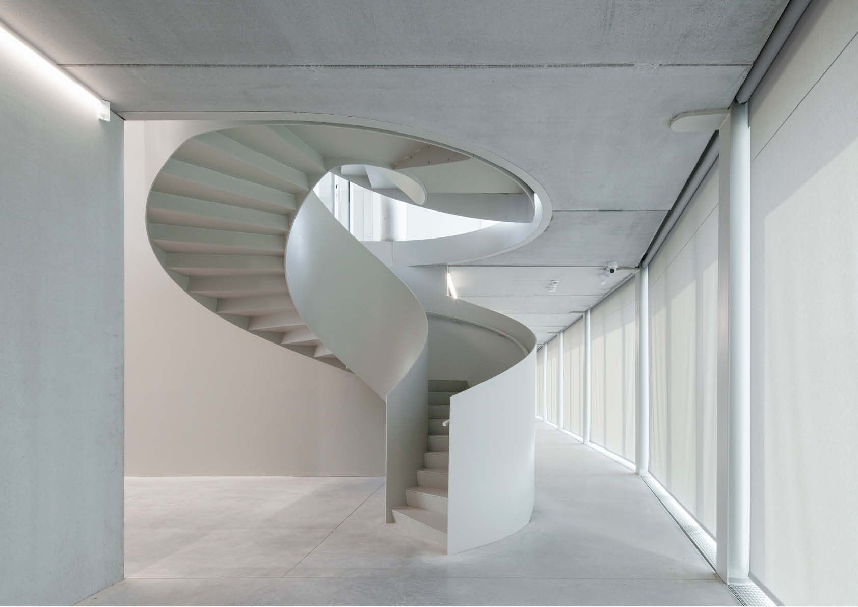 Op het gelijkvloers is een gemeenschappelijke vergaderzaal gekoppeld aan de genereuze inkomhal met uitnodigende ronde trap, die de vloeiende verbinding tussen de drie bouwlagen symboliseert. De zoektocht naar een elegante vormgeving mondde uit in de realisatie van een zelfdragende staalconstructie van 7,8 ton. De trap werd in twee verdiepingshoge delen geprefabriceerd in het atelier. Binnen in het volume van de trap zijn de bordessen verwerkt. Daar zijn de trapwanden doorgetrokken, zodat de onderbreking niet zichtbaar is in het volume. Op die manier ontstaat een imposante architecturale trap met een sterke ‘présence’.