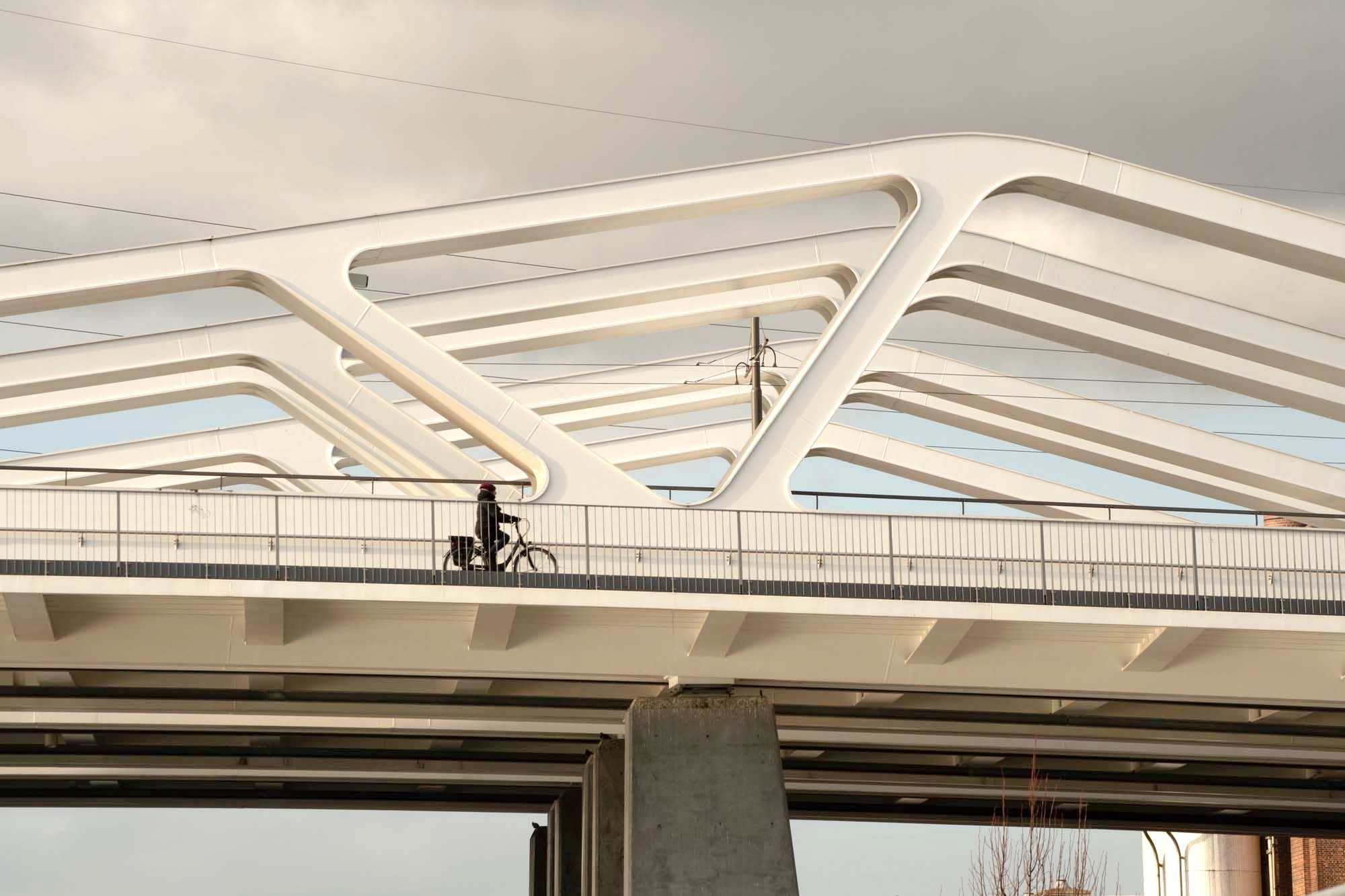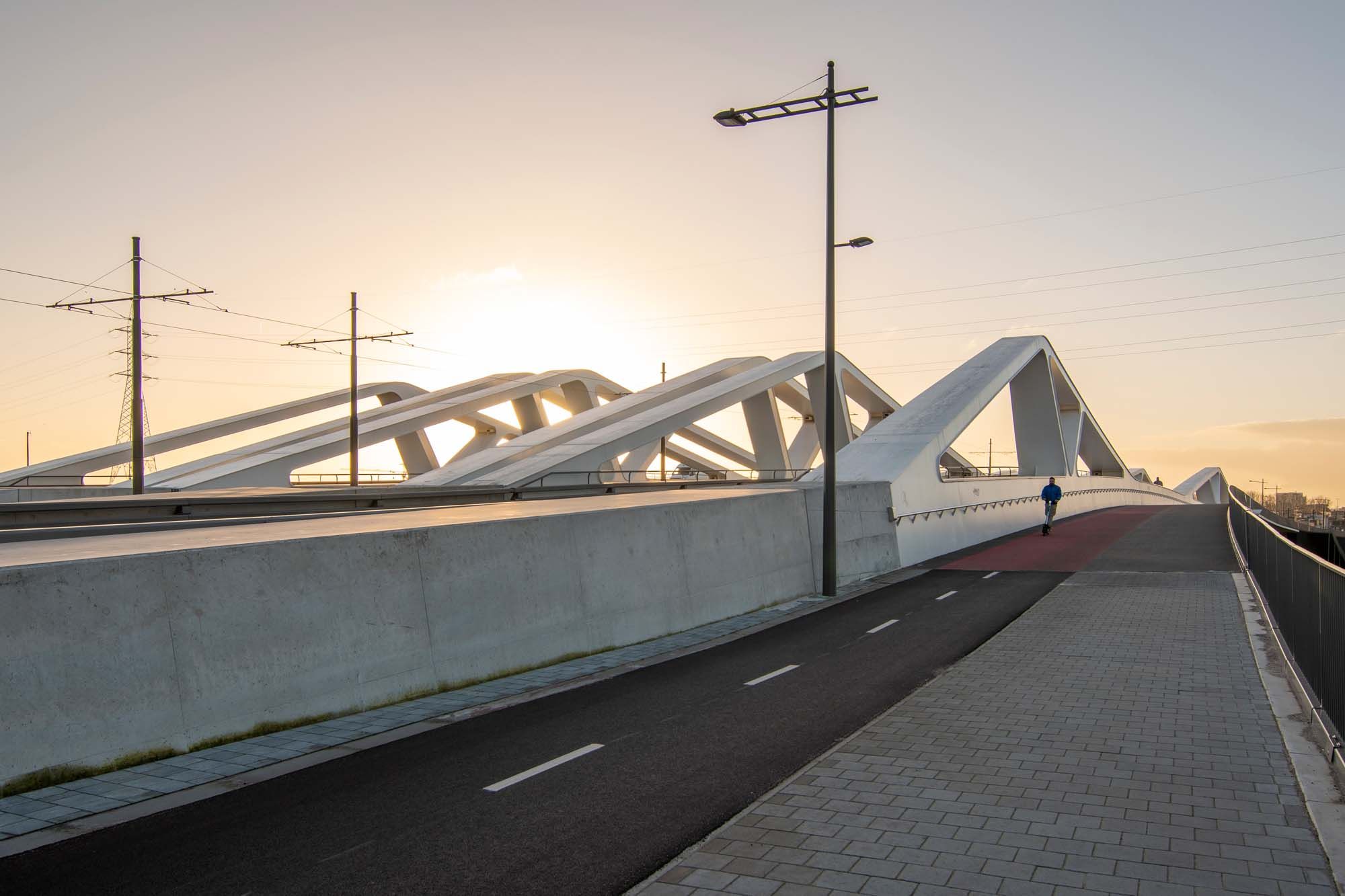 Het Albertkanaal, de belangrijkste waterweg in Vlaanderen, ondergaat aanzienlijke verbeteringen om de capaciteit voor binnenvaart te vergroten. Als onderdeel van het project "Verhogen bruggen Albertkanaal" is bij Merksem, Antwerpen, een bocht in het kanaal verbreed en de doorvaarthoogte vergroot . De nieuwe brug, bestaande uit drie naast elkaar gelegen stalen bruggen valt op door de donkere onderbouw en de witte, opengewerkte constructie.