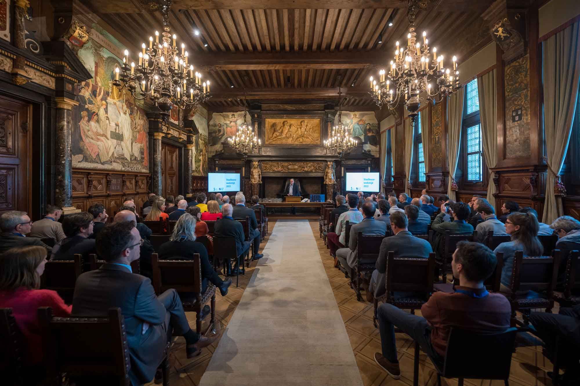 Maar vooraleer over te gaan tot de uitreiking, konden de aanwezigen genieten van een rondleiding door het vernieuwde stadhuis. We liepen door de tentoonstelling op het gelijkvloers en 'van Schoon Verdiep tot Verlicht Verdiep' zoals de ondertitel van het boek, uitgegeven naar aanleiding van de renovatie, klinkt.